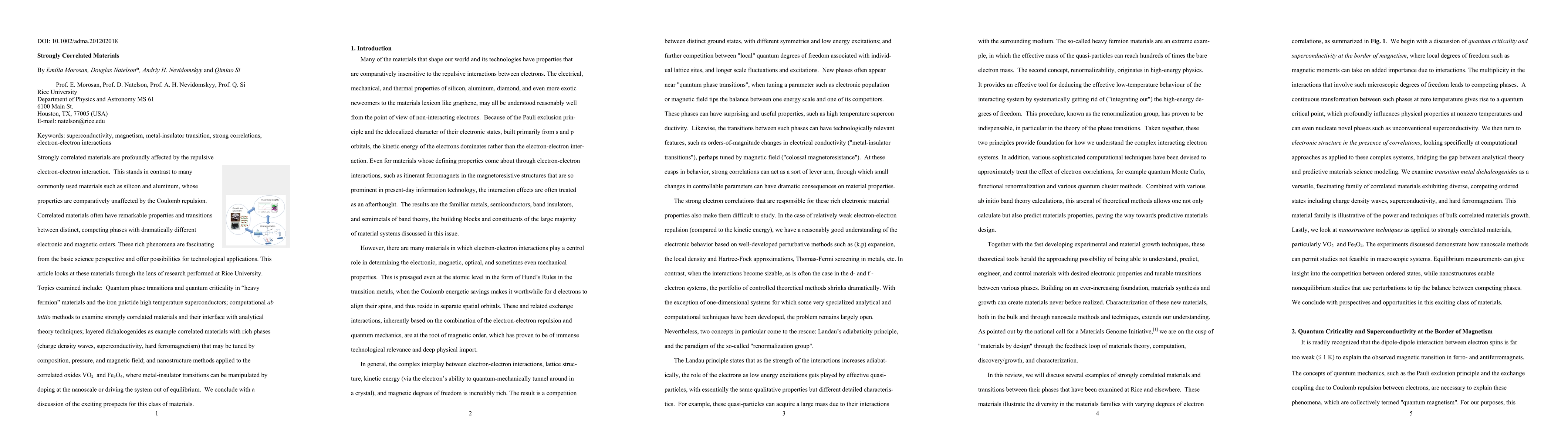 The research examines strongly correlated materials, primarily through studies at Rice University, utilizing methods such as computational ab initio techniques, nanostructure methods, and experimental investigations on materials like 'heavy fermion' compounds, iron pnictide superconductors, layered dichalcogenides, and correlated oxides VO2 and Fe3O4.