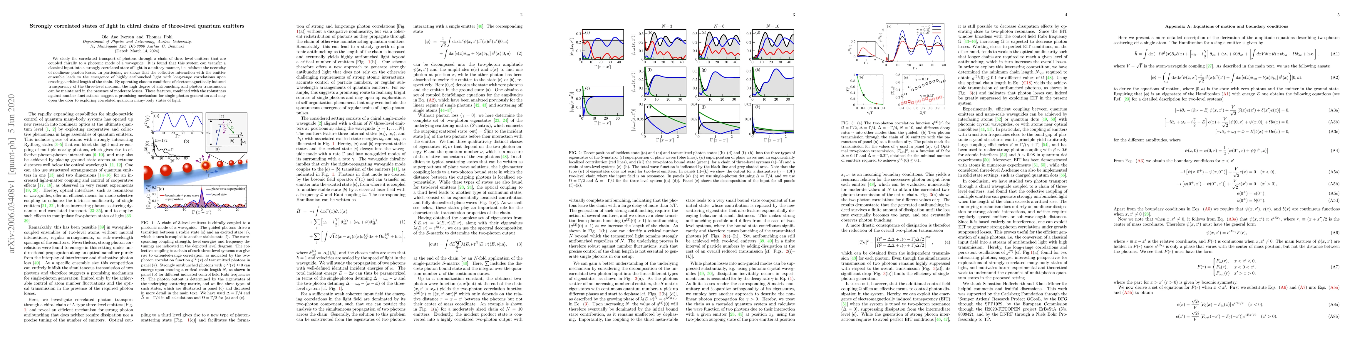 This paper investigates the correlated transport of photons through a chiral chain of three-level quantum emitters, revealing the emergence of strongly correlated, highly antibunched light states without nonlinear losses. The system's robustness against number fluctuations suggests potential for single-photon generation and exploration of quantum many-body states of light.
