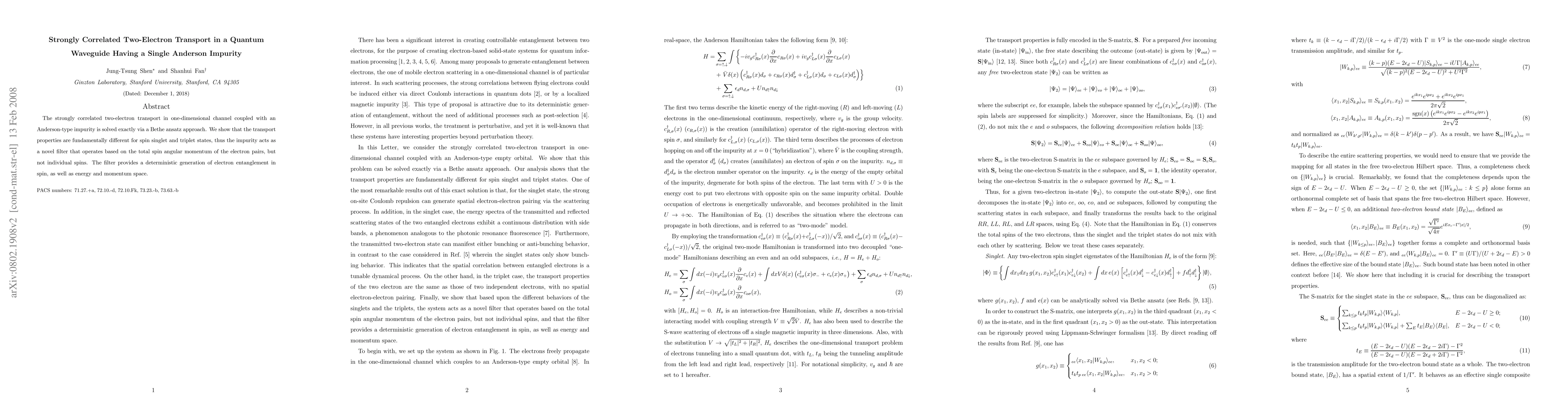 This paper uses a Bethe ansatz to solve for strongly correlated two-electron transport in a quantum waveguide with an Anderson impurity, revealing a novel spin-based filter that differentiates between spin singlet and triplet states, generating electron entanglement based on total spin angular momentum.