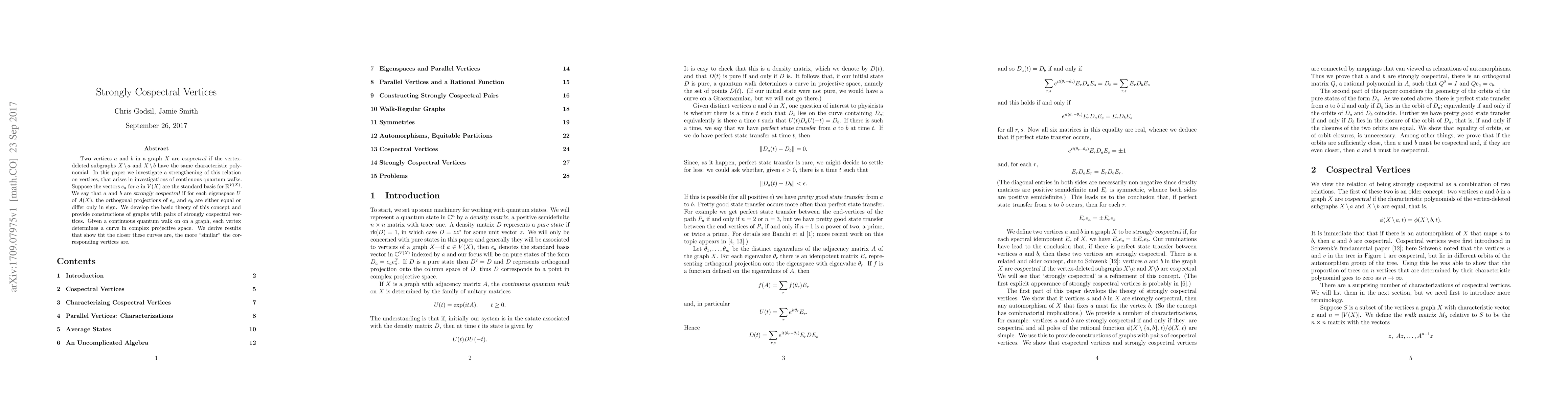 Two vertices $a$ and $b$ in a graph $X$ are cospectral if the vertex-deleted subgraphs $X\setminus a$ and $X\setminus b$ have the same characteristic polynomial. In this paper we investigate a strengthening of this relation on vertices, that arises in investigations of continuous quantum walks. Suppose the vectors $e_a$ for $a$ in $V(X)$ are the standard basis for $\mathbb{R}^{V(X)}$. We say that $a$ and $b$ are strongly cospectral if, for each eigenspace $U$ of $A(X)$, the orthogonal projections of $e_a$ and $e_b$ are either equal or differ only in sign. We develop the basic theory of this concept and provide constructions of graphs with pairs of strongly cospectral vertices. Given a continuous quantum walk on on a graph, each vertex determines a curve in complex projective space. We derive results that show tht the closer these curves are, the more "similar" the corresponding vertices are.