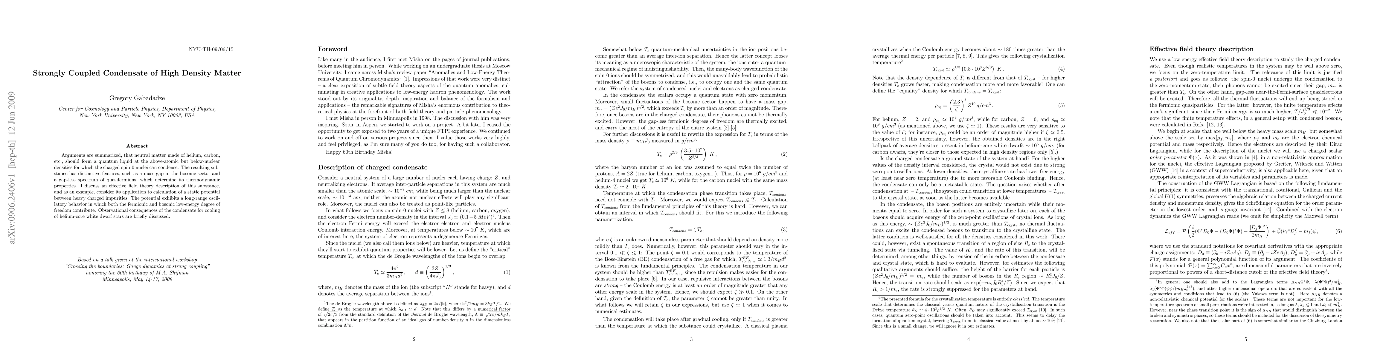 Arguments are summarized, that neutral matter made of helium, carbon, etc., should form a quantum liquid at the above-atomic but below-nuclear densities for which the charged spin-0 nuclei can condense. The resulting substance has distinctive features, such as a mass gap in the bosonic sector and a gap-less spectrum of quasifermions, which determine its thermodynamic properties. I discuss an effective field theory description of this substance, and as an example, consider its application to calculation of a static potential between heavy charged impurities. The potential exhibits a long-range oscillatory behavior in which both the fermionic and bosonic low-energy degree of freedom contribute. Observational consequences of the condensate for cooling of helium-core white dwarf stars are briefly discussed.