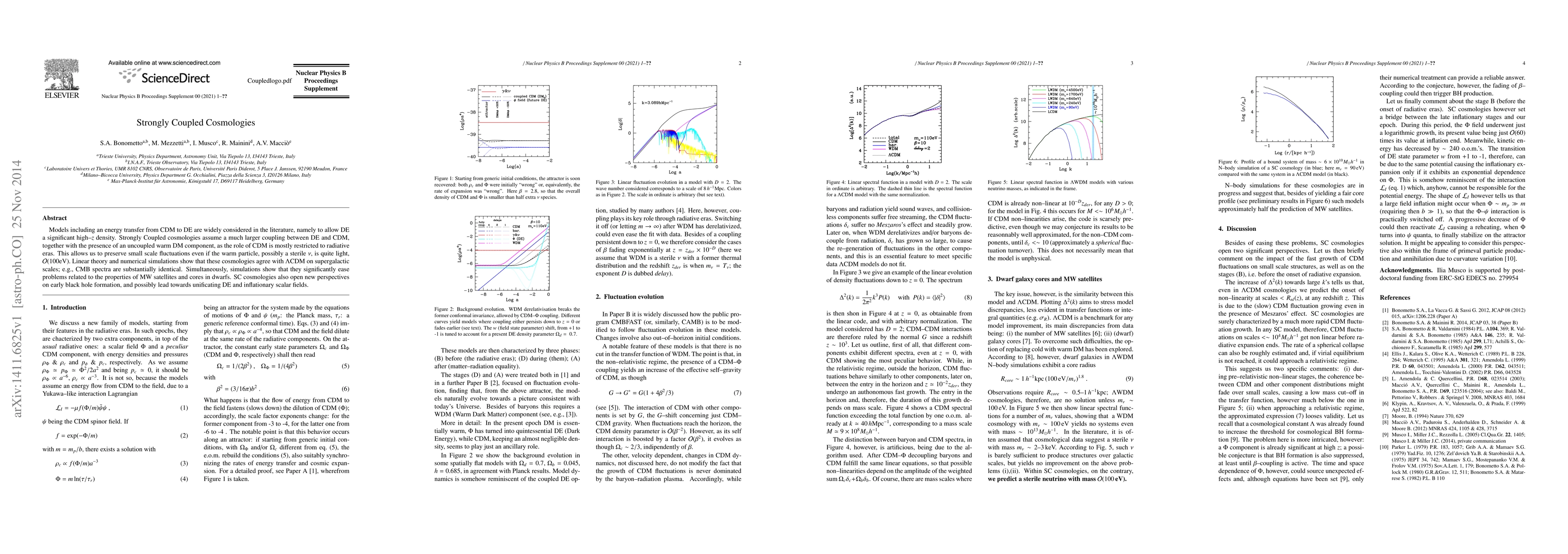 Models including an energy transfer from CDM to DE are widely considered in the literature, namely to allow DE a significant high-z density. Strongly Coupled cosmologies assume a much larger coupling between DE and CDM, together with the presence of an uncoupled warm DM component, as the role of CDM is mostly restricted to radiative eras. This allows us to preserve small scale fluctuations even if the warm particle, possibly a sterile neutrino, is quite light, O(100 eV). Linear theory and numerical simulations show that these cosmologies agree with LCDM on supergalactic scales; e.g., CMB spectra are substantially identical. Simultaneously, simulations show that they significantly ease problems related to the properties of MW satellites and cores in dwarfs. SC cosmologies also open new perspectives on early black hole formation, and possibly lead towards unificating DE and inflationary scalar fields.