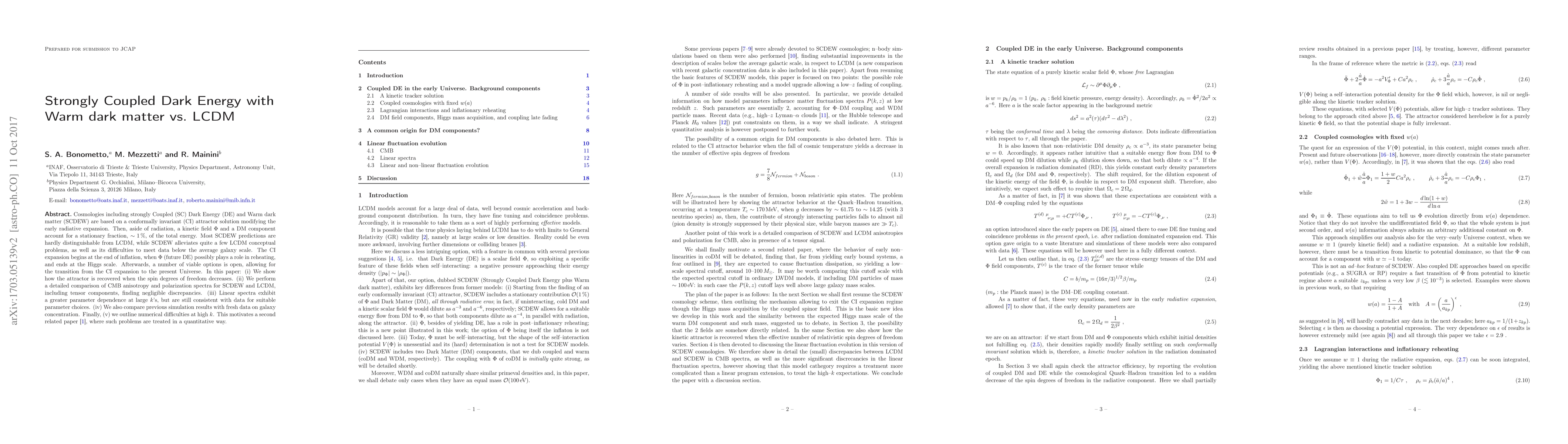 Cosmologies including strongly Coupled (SC) Dark Energy (DE) and Warm dark matter (SCDEW) are based on a conformally invariant (CI) attractor solution modifying the early radiative expansion. Then, aside of radiation, a kinetic field $\Phi$ and a DM component account for a stationary fraction, $\sim 1\, \%$, of the total energy. Most SCDEW predictions are hardly distinguishable from LCDM, while SCDEW alleviates quite a few LCDM conceptual problems, as well as its difficulties to meet data below the average galaxy scale. The CI expansion begins at the inflation end, when $\Phi$ (future DE) possibly plays a role in reheating, and ends at the Higgs' scale. Afterwards, a number of viable options is open, allowing for the transition from the CI expansion to the present Universe. In this paper: (i) We show how the attractor is recovered when the spin degrees of freedom decreases. (ii) We perform a detailed comparison of CMB anisotropy and polarization spectra for SCDEW and LCDM, including tensor components, finding negligible discrepancies. (iii) Linear spectra exhibit a greater parameter dependence at large $k$'s, but are still consistent with data for suitable parameter choices. (iv) We also compare previous simulation results with fresh data on galaxy concentration. Finally, (v) we outline numerical difficulties at high $k$. This motivates a second related paper, where such problems are treated in a quantitative way.