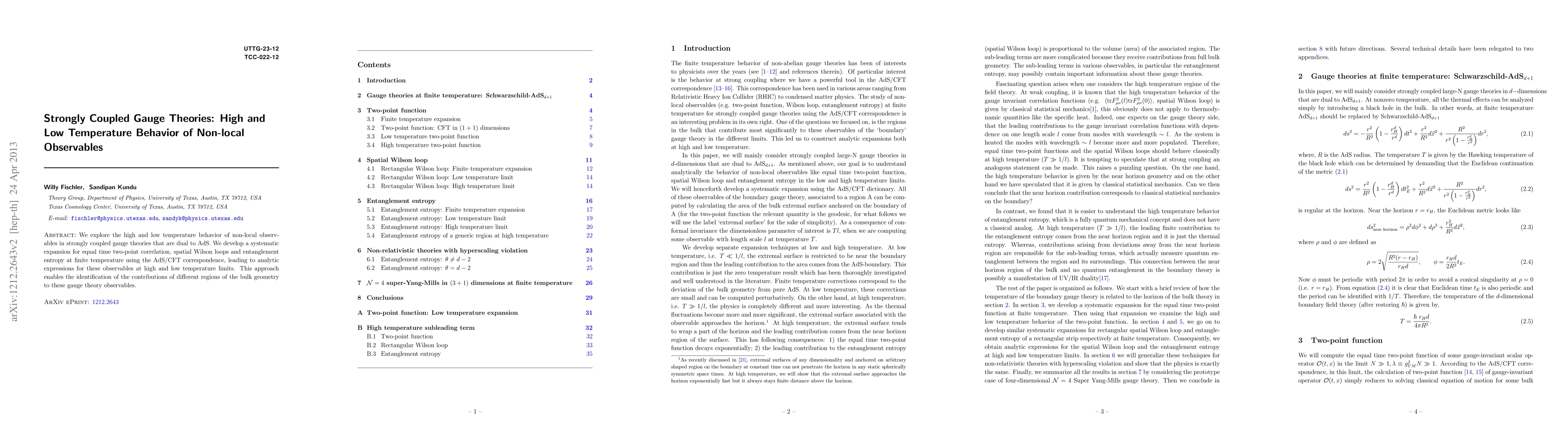 This paper investigates the high and low temperature behavior of non-local observables in strongly coupled gauge theories via the AdS/CFT correspondence, developing a systematic expansion to derive analytic expressions for correlation functions, Wilson loops, and entanglement entropy, and identifying bulk geometry contributions.