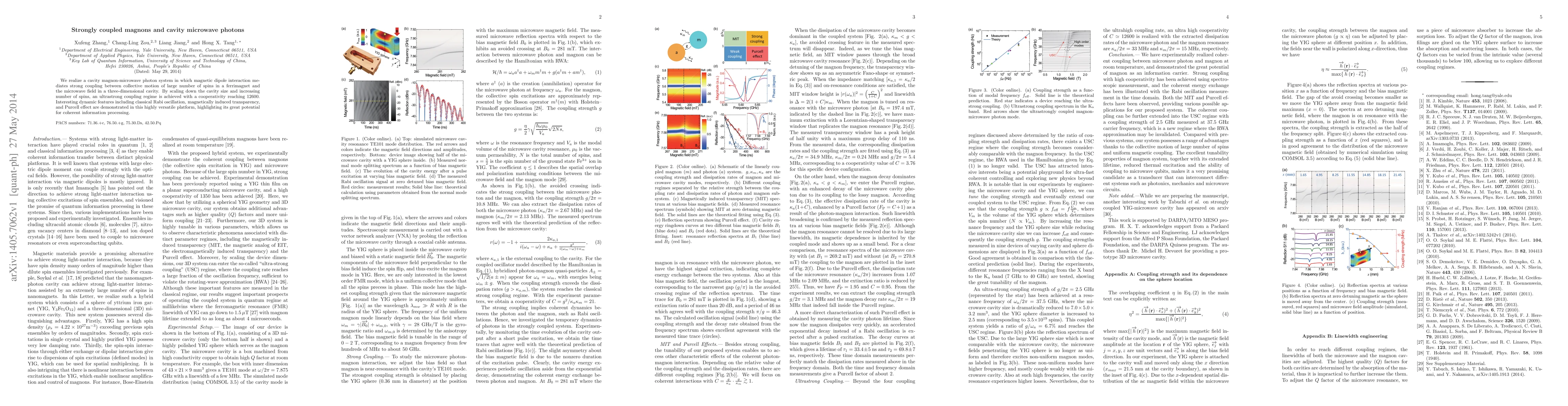 We realize a cavity magnon-microwave photon system in which magnetic dipole interaction mediates strong coupling between collective motion of large number of spins in a ferrimagnet and the microwave field in a three-dimensional cavity. By scaling down the cavity size and increasing number of spins, an ultrastrong coupling regime is achieved with a cooperativity reaching 12600. Interesting dynamic features including classical Rabi oscillation, magnetically induced transparency, and Purcell effect are demonstrated in this highly versatile platform, highlighting its great potential for coherent information processing.