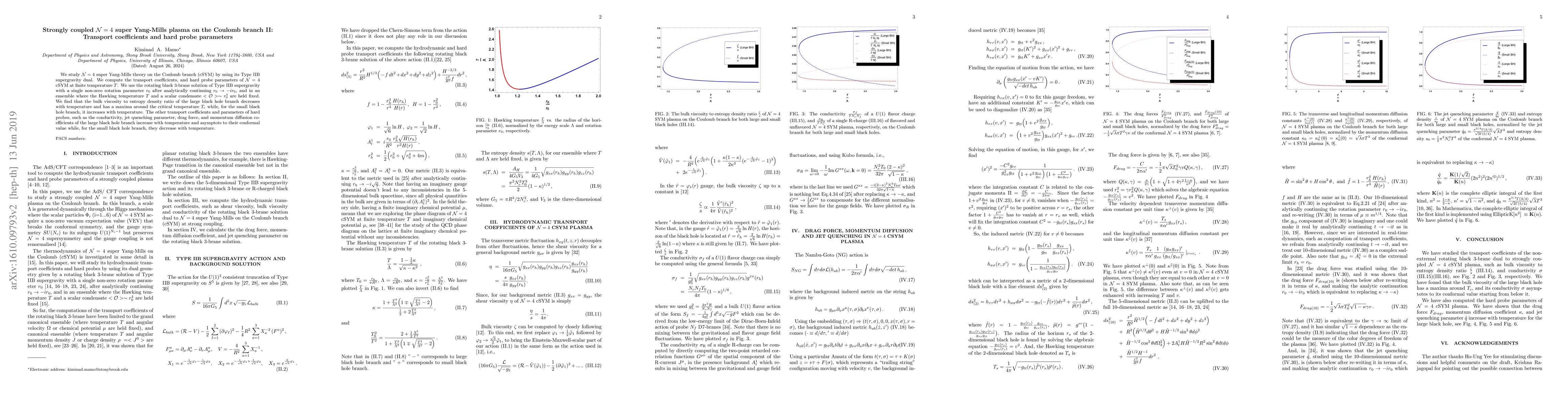 We study $\mathcal{N} = 4$ super Yang-Mills theory on the Coulomb branch (cSYM) by using its Type IIB supergravity dual. We compute the transport coefficients, and hard probe parameters of $\mathcal{N} = 4$ cSYM at finite temperature $T$. We use the rotating black 3-brane solution of Type IIB supergravity with a single non-zero rotation parameter $r_{0}$ after analytically continuing $r_{0}\rightarrow -ir_{0}$, and in an ensemble where the Hawking temperature $T$ and a scalar condensate $<\mathcal{O}>\sim r_{0}^4$ are held fixed. We find that the bulk viscosity to entropy density ratio of the large black hole branch decreases with temperature and has a maxima around the critical temperature $T_{c}$ while, for the small black hole branch, it increases with temperature. The other transport coefficients and parameters of hard probes, such as the conductivity, jet quenching parameter, drag force, and momentum diffusion coefficients of the large black hole branch increase with temperature and asymptote to their conformal value while, for the small black hole branch, they decrease with temperature.