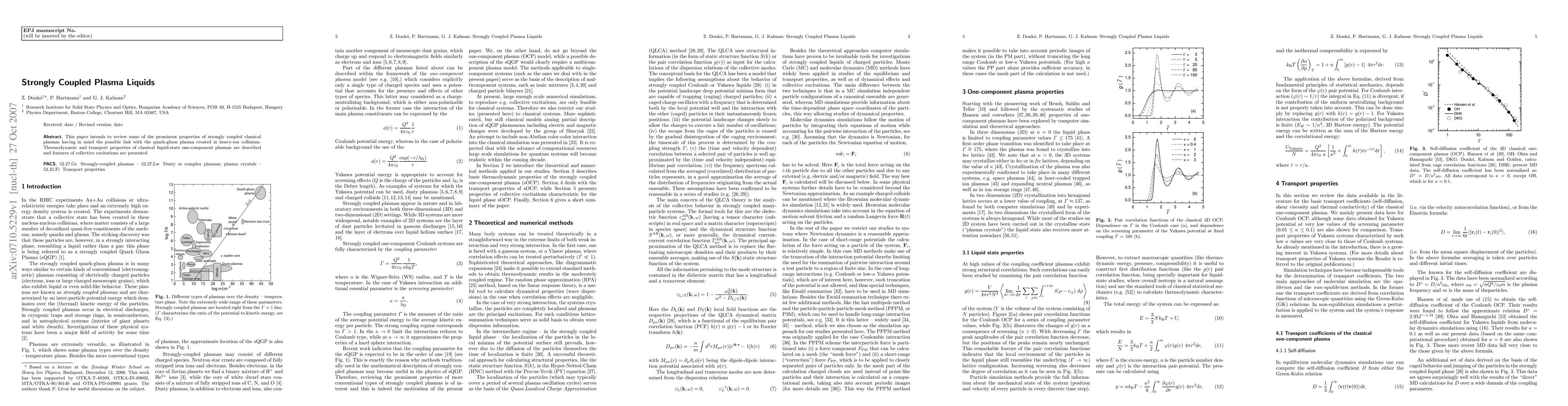 This paper reviews properties of strongly coupled classical plasmas, exploring their connections to quark-gluon plasma from heavy-ion collisions. It describes thermodynamic and transport properties, as well as collective excitations in these plasmas.