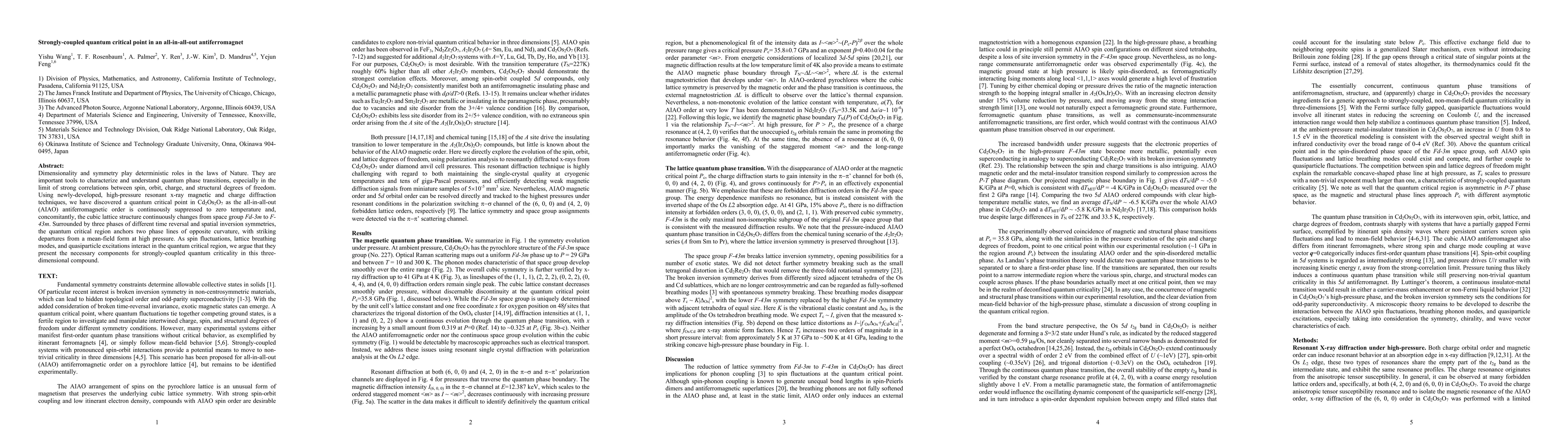 Dimensionality and symmetry play deterministic roles in the laws of Nature. They are important tools to characterize and understand quantum phase transitions, especially in the limit of strong correlations between spin, orbit, charge, and structural degrees of freedom. Using newly-developed, high-pressure resonant x-ray magnetic and charge diffraction techniques, we have discovered a quantum critical point in Cd2Os2O7 as the all-in-all-out (AIAO) antiferromagnetic order is continuously suppressed to zero temperature and, concomitantly, the cubic lattice structure continuously changes from space group Fd-3m to F-43m. Surrounded by three phases of different time reversal and spatial inversion symmetries, the quantum critical region anchors two phase lines of opposite curvature, with striking departures from a mean-field form at high pressure. As spin fluctuations, lattice breathing modes, and quasiparticle excitations interact in the quantum critical region, we argue that they present the necessary components for strongly-coupled quantum criticality in this three-dimensional compound.
