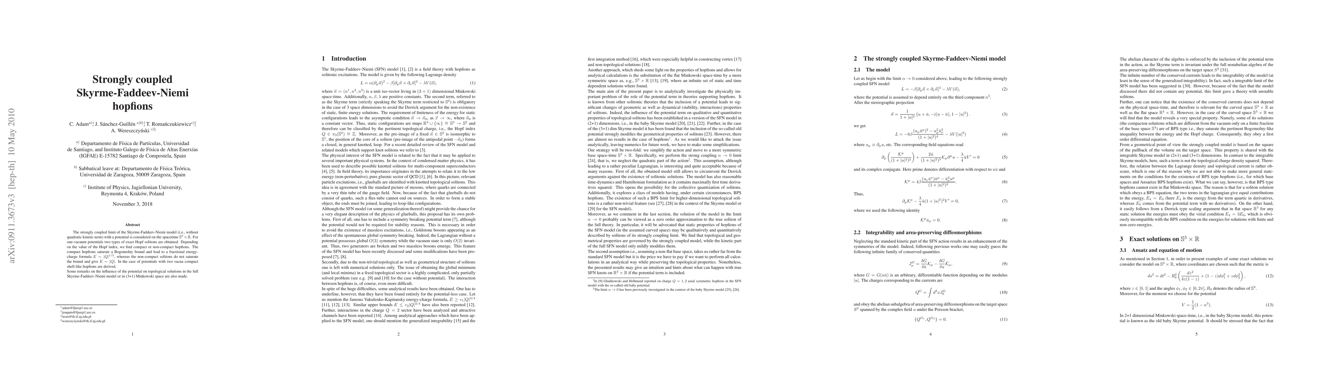 This paper investigates the strongly coupled Skyrme-Faddeev-Niemi model on S^3 x R, identifying two types of exact Hopf solitons: compact and non-compact hopfions. Compact hopfions exhibit a fractional energy-charge relation, while non-compact ones do not saturate the Bogomolny bound.