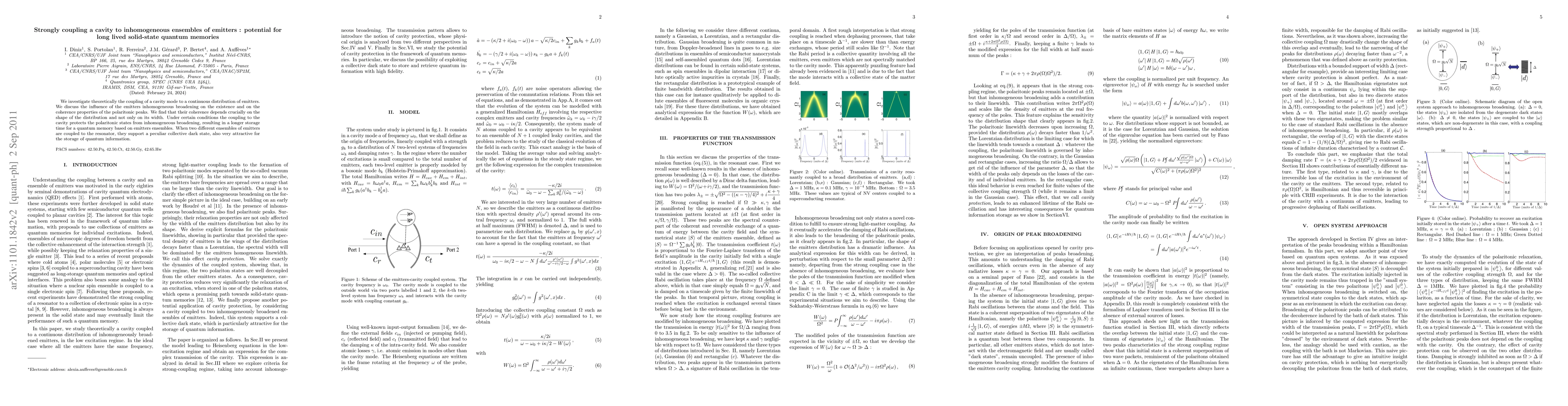 We investigate theoretically the coupling of a cavity mode to a continuous distribution of emitters. We discuss the influence of the emitters inhomogeneous broadening on the existence and on the coherence properties of the polaritonic peaks. We find that their coherence depends crucially on the shape of the distribution and not only on its width. Under certain conditions the coupling to the cavity protects the polaritonic states from inhomogeneous broadening, resulting in a longer storage time for a quantum memory based on emitters ensembles. When two different ensembles of emitters are coupled to the resonator, they support a peculiar collective dark state, also very attractive for the storage of quantum information.