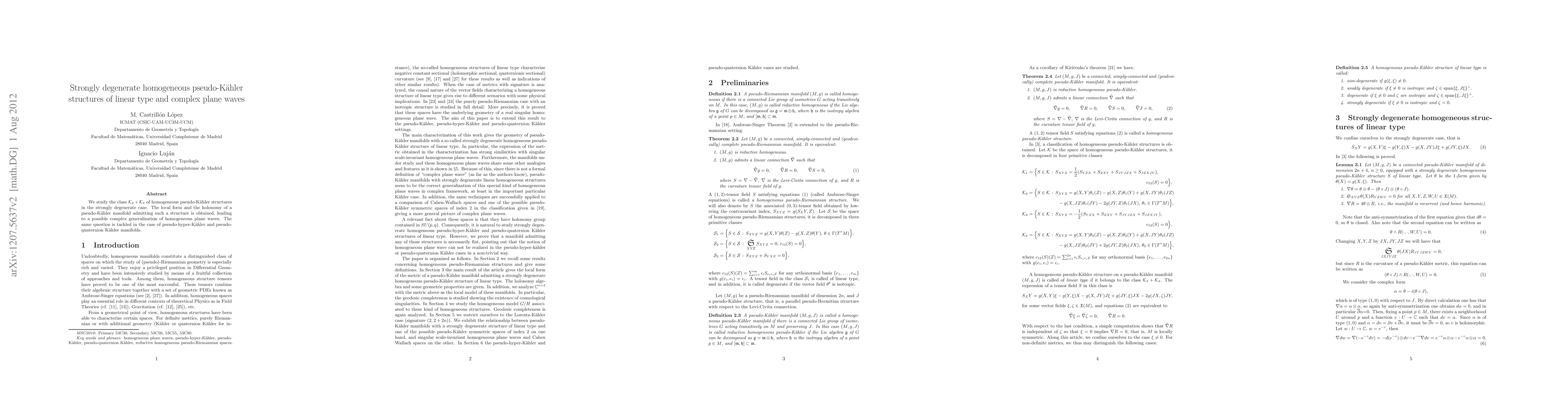 We study the class $\mathcal{K}_{2}+\mathcal{K}_{4}$ of homogeneous pseudo-K\"ahler structures in the strongly degenerate case. The local form and the holonomy of a pseudo-K\"ahler manifold admitting such a structure is obtained, leading to a possible complex generalization of homogeneous plane waves. The same question is tackled in the case of pseudo-hyper-K\"ahler and pseudo-quaternion K\"ahler manifolds.