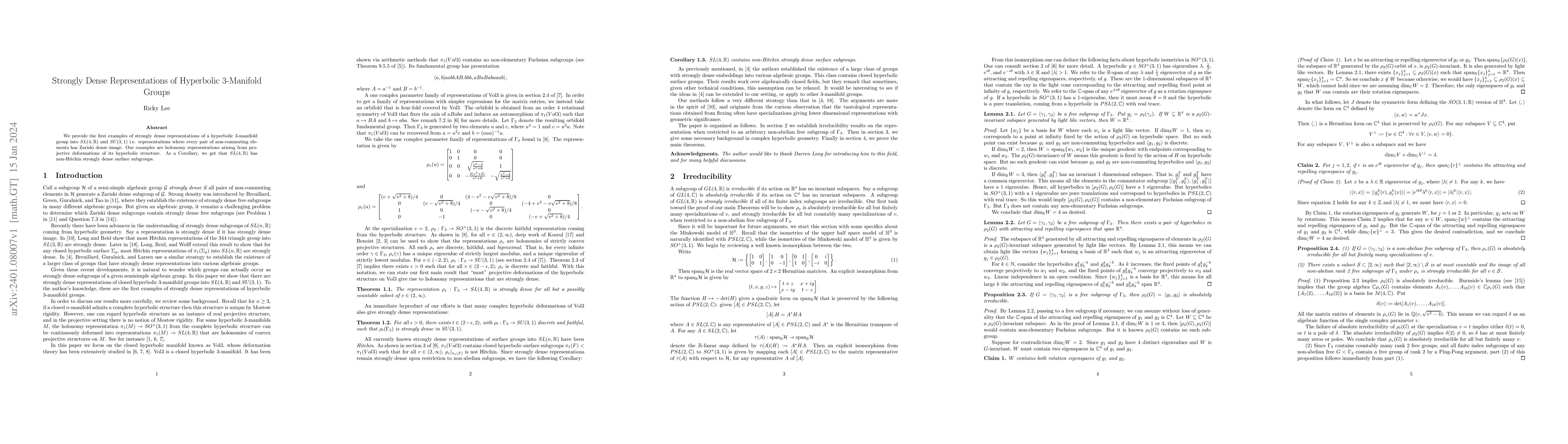 This paper presents the first examples of strongly dense representations of hyperbolic 3-manifold groups into $SL(4,\mathbb{R})$ and $SU(3,1)$, where non-commuting elements yield Zariski dense images. These representations are derived from holonomy representations of projective deformations of hyperbolic structures.