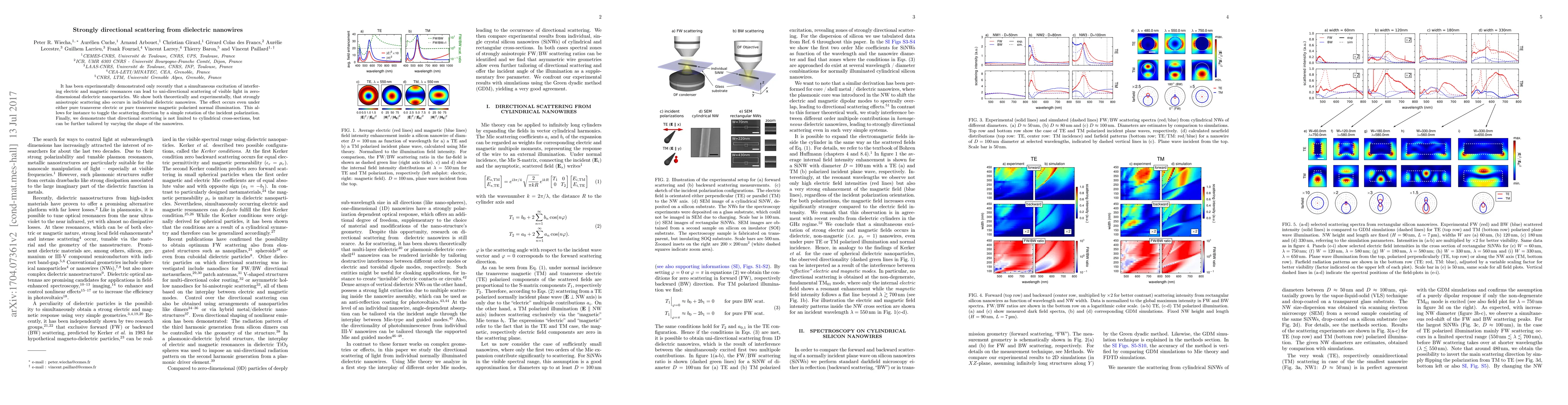 This research demonstrates that dielectric nanowires can exhibit strongly directional scattering of visible light due to the simultaneous excitation of interfering electric and magnetic resonances, allowing for the control of scattering direction through polarization rotation and shape modification.