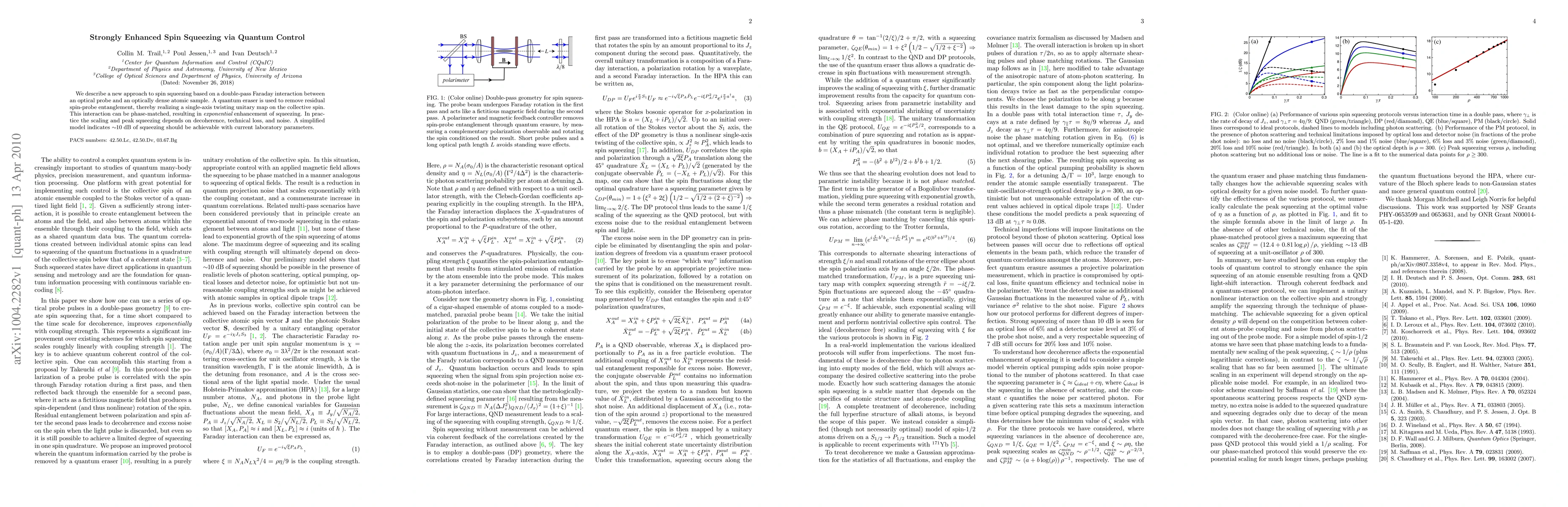 This paper proposes a novel method for achieving strongly enhanced spin squeezing through a double-pass Faraday interaction and quantum eraser technique, leading to exponential enhancement and up to ~10 dB of achievable squeezing under current laboratory conditions. Practical limitations include decoherence, technical loss, and noise.