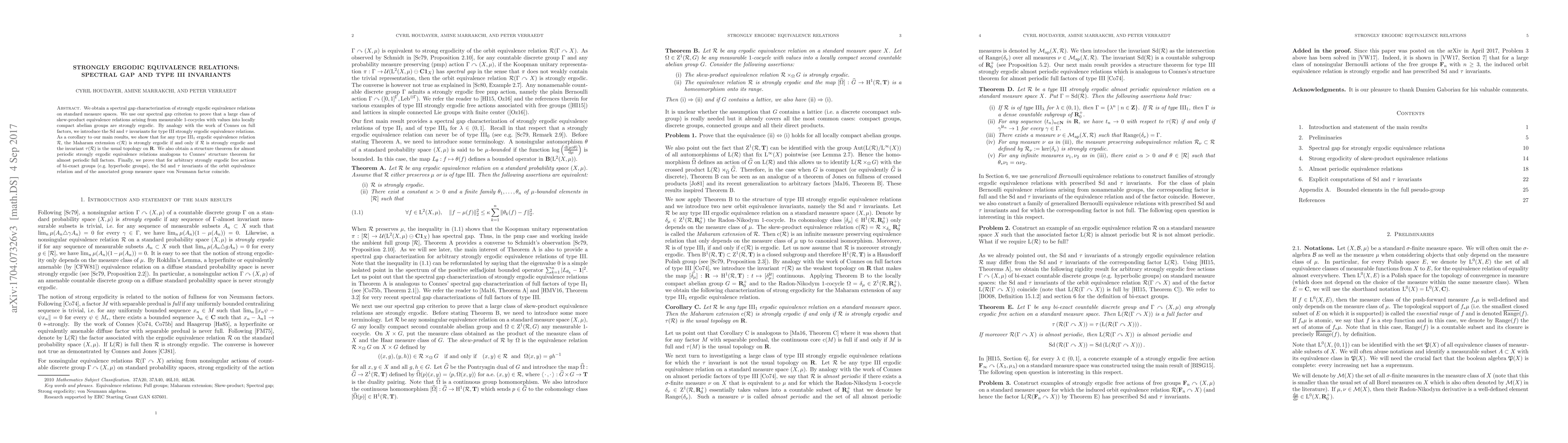 We obtain a spectral gap characterization of strongly ergodic equivalence relations on standard measure spaces. We use our spectral gap criterion to prove that a large class of skew-product equivalence relations arising from measurable $1$-cocycles with values into locally compact abelian groups are strongly ergodic. By analogy with the work of Connes on full factors, we introduce the Sd and $\tau$ invariants for type ${\rm III}$ strongly ergodic equivalence relations. As a corollary to our main results, we show that for any type ${\rm III_1}$ ergodic equivalence relation $\mathcal R$, the Maharam extension $\mathord{\text {c}}(\mathcal R)$ is strongly ergodic if and only if $\mathcal R$ is strongly ergodic and the invariant $\tau(\mathcal R)$ is the usual topology on $\mathbf R$. We also obtain a structure theorem for almost periodic strongly ergodic equivalence relations analogous to Connes' structure theorem for almost periodic full factors. Finally, we prove that for arbitrary strongly ergodic free actions of bi-exact groups (e.g. hyperbolic groups), the Sd and $\tau$ invariants of the orbit equivalence relation and of the associated group measure space von Neumann factor coincide.