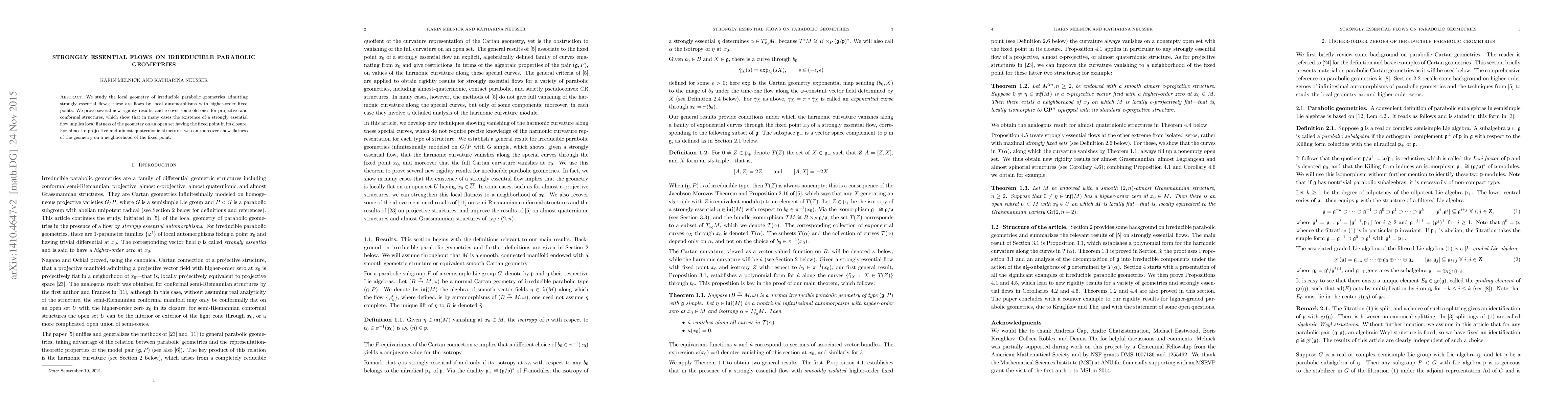 Researchers prove that strongly essential flows on irreducible parabolic geometries imply local flatness of the geometry in certain cases, leading to new rigidity results and insights into their properties.