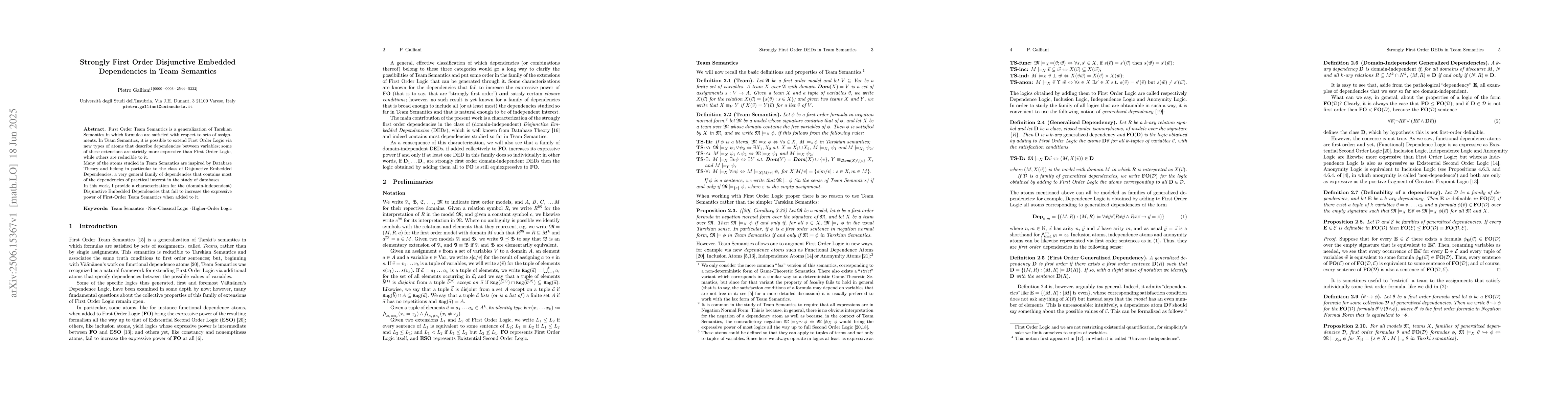 First Order Team Semantics is a generalization of Tarskian Semantics in which formulas are satisfied with respect to sets of assignments. In Team Semantics, it is possible to extend First Order Logic via new types of atoms that describe dependencies between variables; some of these extensions are strictly more expressive than First Order Logic, while others are reducible to it. Many of the atoms studied in Team Semantics are inspired by Database Theory and belong in particular to the class of Disjunctive Embedded Dependencies, a very general family of dependencies that contains most of the dependencies of practical interest in the study of databases. In this work, I provide a characterization for the (domain-independent) Disjunctive Embedded Dependencies that fail to increase the expressive power of First-Order Team Semantics when added to it.