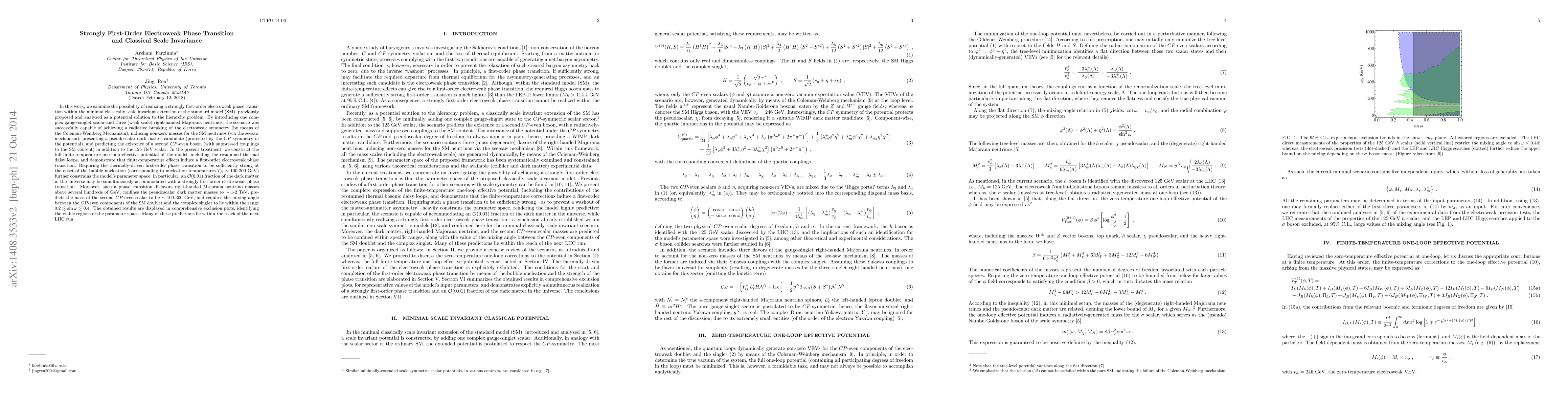 This paper explores a strongly first-order electroweak phase transition in a minimal classically scale invariant extension of the Standard Model, introducing a complex singlet scalar and right-handed Majorana neutrinos. The model predicts a second $CP$-even boson, pseudoscalar dark matter, and constrains parameters to ensure a sufficiently strong phase transition, with many predictions testable at future LHC runs.