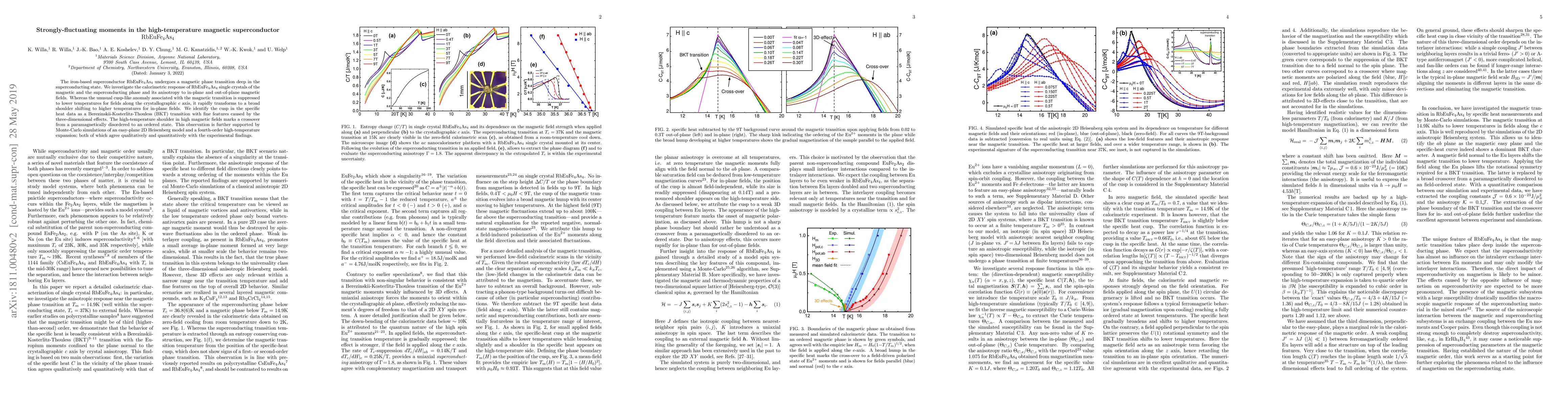 We report detailed specific heat measurements on the recently discovered magnetic superconductor RbEuFe$_4$As$_4$. We investigated the superconducting transition at 37K and extract the phase boundary for in and out-of plane fields resulting in an anisotropy ratio of 1.8. An unusual cusp-like feature in the calorimetric data near 14.9K marks the onset of a magnetic phase. Studying the effect of small fields along the crystallographic $c$ axis, we resolve a shift in the cusp position moving to lower temperatures. For in-plane fields the cusp rapidly disappears and a broad shoulder that shifts to higher temperatures. We are able to reproduce our measured calorimetry data quantitatively by Monte-Carlo simulations of an anisotropic easy-plane 2D Heisenberg model. We can thus show that (i) the spins are preferably in plane, (ii) the cusp in specific heat is due to a Berezinskii-Kosterlitz-Thouless (BKT) transition, and (iii) the high-temperature hump in higher fields marks a crossover from a paramagnetically disordered to an ordered state. The extracted phase and crossover boundaries from experiment and simulations agree very well.