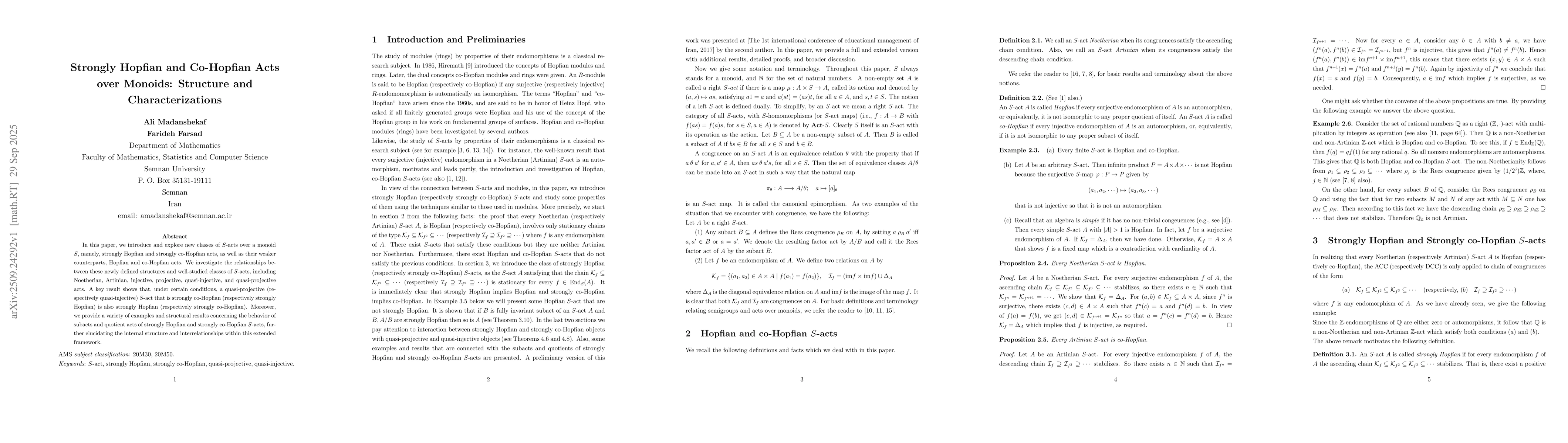 The paper introduces and explores new classes of S-acts over monoids, namely strongly Hopfian and strongly co-Hopfian acts, and investigates their relationships with existing classes like Noetherian, Artinian, injective, projective, quasi-injective, and quasi-projective acts. It uses algebraic structures and properties of monoids and acts to derive characterizations and structural results.