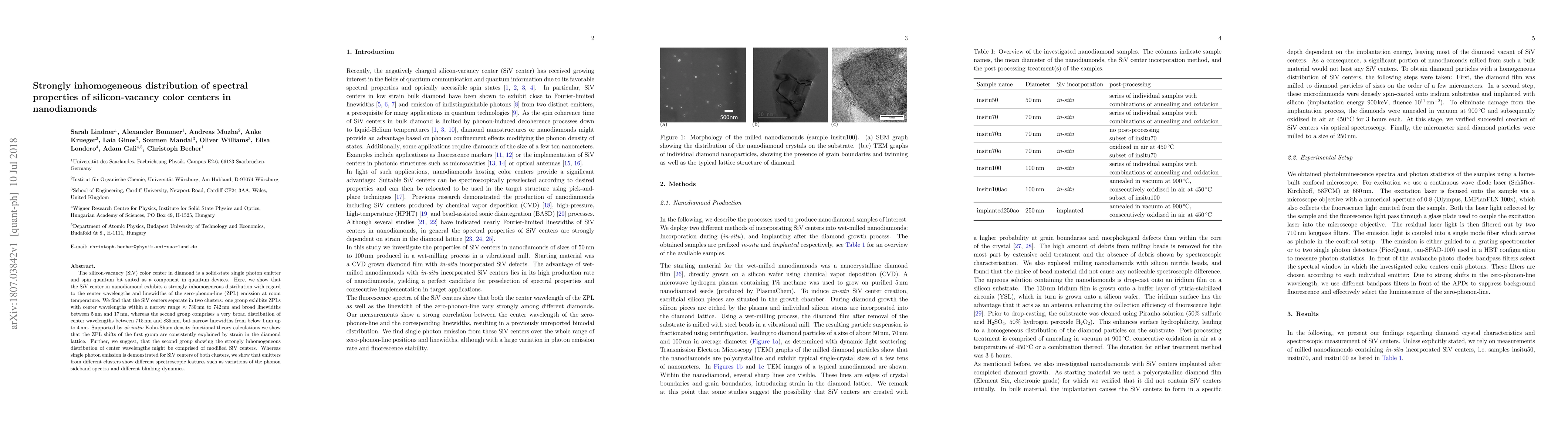 This paper investigates the inhomogeneous distribution of silicon-vacancy (SiV) color centers in nanodiamonds, revealing two distinct clusters based on zero-phonon line (ZPL) emission properties. The first cluster shows narrow ZPL wavelengths with broad linewidths, explained by lattice strain, while the second cluster exhibits a wide range of ZPL wavelengths and narrow linewidths, suggesting modified SiV centers.