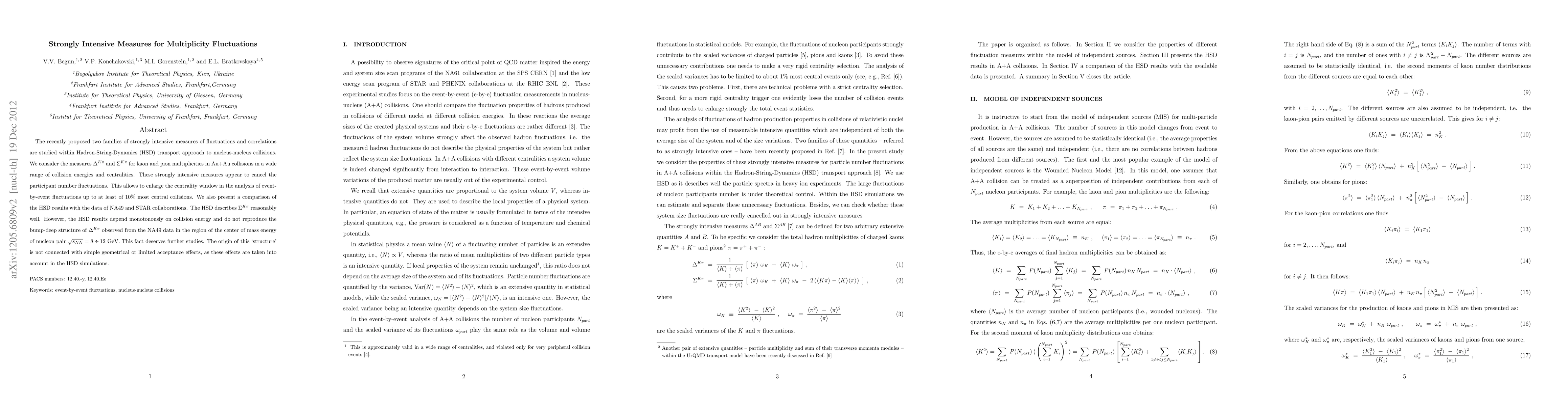The recently proposed two families of strongly intensive measures of fluctuations and correlations are studied within Hadron-String-Dynamics (HSD) transport approach to nucleus-nucleus collisions. We consider the measures $\Delta^{K\pi}$ and $\Sigma^{K\pi}$ for kaon and pion multiplicities in Au+Au collisions in a wide range of collision energies and centralities. These strongly intensive measures appear to cancel the participant number fluctuations. This allows to enlarge the centrality window in the analysis of event-by-event fluctuations up to at least of 10% most central collisions. We also present a comparison of the HSD results with the data of NA49 and STAR collaborations. The HSD describes $\Sigma^{K\pi}$ reasonably well. However, the HSD results depend monotonously on collision energy and do not reproduce the bump-deep structure of $\Delta^{K\pi}$ observed from the NA49 data in the region of the center of mass energy of nucleon pair $\sqrt{s_{NN}}= 8\div 12$ GeV. This fact deserves further studies. The origin of this `structure' is not connected with simple geometrical or limited acceptance effects, as these effects are taken into account in the HSD simulations.
