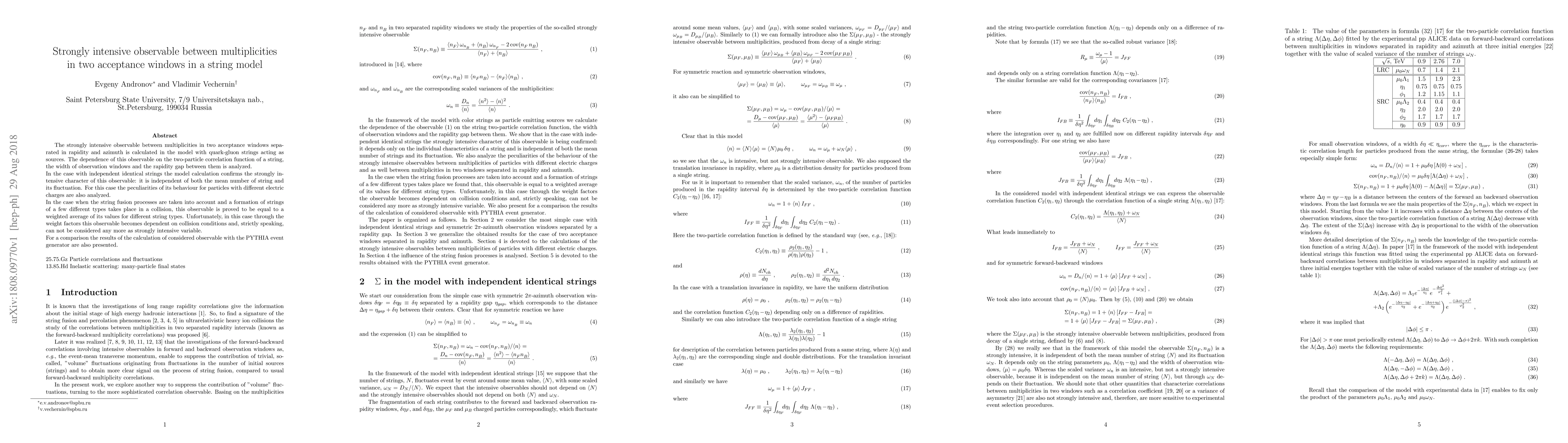 This paper calculates a strongly intensive observable between particle multiplicities in two acceptance windows in a string model, confirming its independence from mean string number and fluctuations in independent string scenarios. However, when string fusion and multiple string types are considered, the observable becomes dependent on collision conditions, losing its strongly intensive character.
