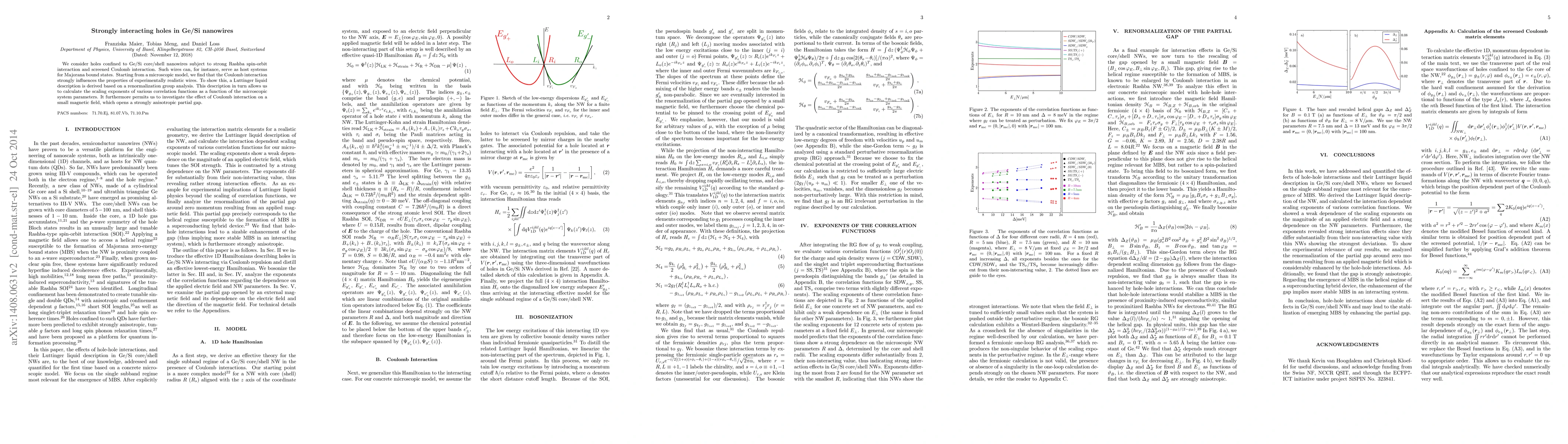 This research investigates holes in Ge/Si nanowires under strong Rashba spin-orbit and screened Coulomb interactions, finding that Coulomb effects significantly alter wire properties. A Luttinger liquid model derived from renormalization group analysis allows for the calculation of scaling exponents and the study of the anisotropic partial gap induced by a small magnetic field.