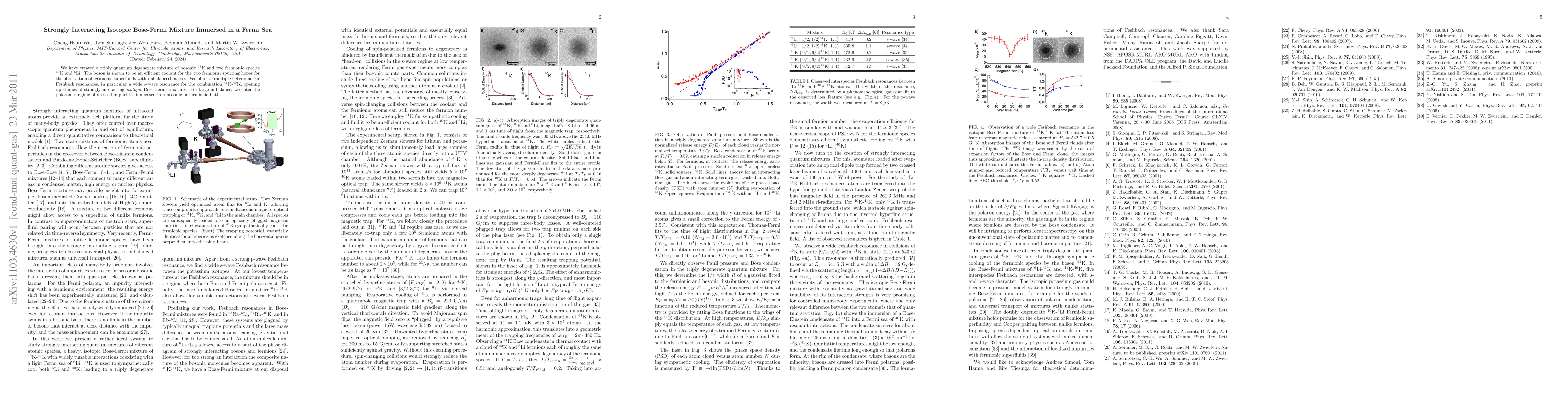 This research reports the creation of a quantum degenerate mixture of bosonic $^{41}$K and fermionic $^{40}$K and $^6$Li, demonstrating the bosonic species as an effective coolant. The study identifies multiple heteronuclear Feshbach resonances, notably a wide s-wave resonance for $^{41}$K-$^{40}$K, facilitating investigations into strongly interacting isotopic Bose-Fermi mixtures and the polaronic regime.