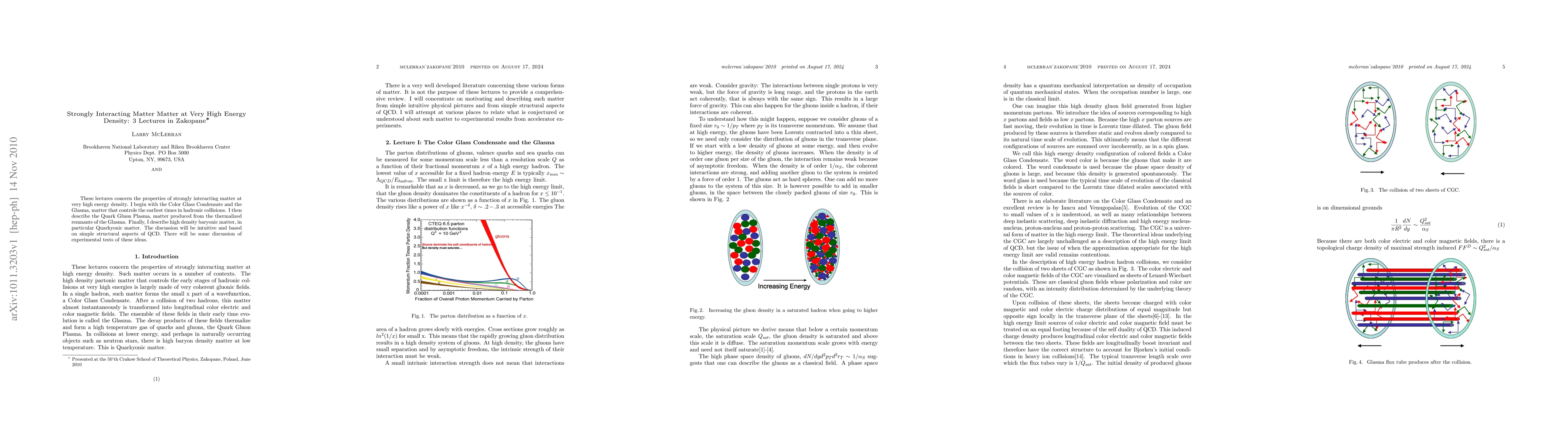 These lectures concern the properties of strongly interacting matter at very high energy density. I begin with the Color Glass Condensate and the Glasma, matter that controls the earliest times in hadronic collisions. I then describe the Quark Gluon Plasma, matter produced from the thermalized remnants of the Glasma. Finally, I describe high density baryonic matter, in particular Quarkyonic matter. The discussion will be intuitive and based on simple structural aspects of QCD. There will be some discussion of experimental tests of these ideas.