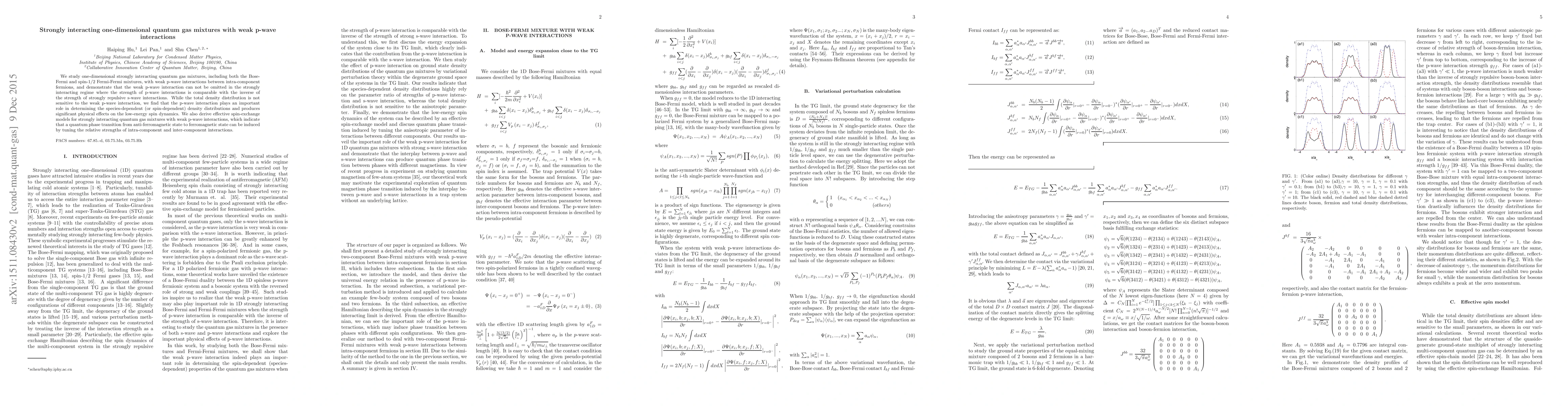 This paper investigates one-dimensional quantum gas mixtures with strong interactions and weak p-wave interactions, showing that p-wave interactions significantly affect species-dependent density distributions and low-energy spin dynamics, while also predicting a quantum phase transition influenced by interaction strengths.