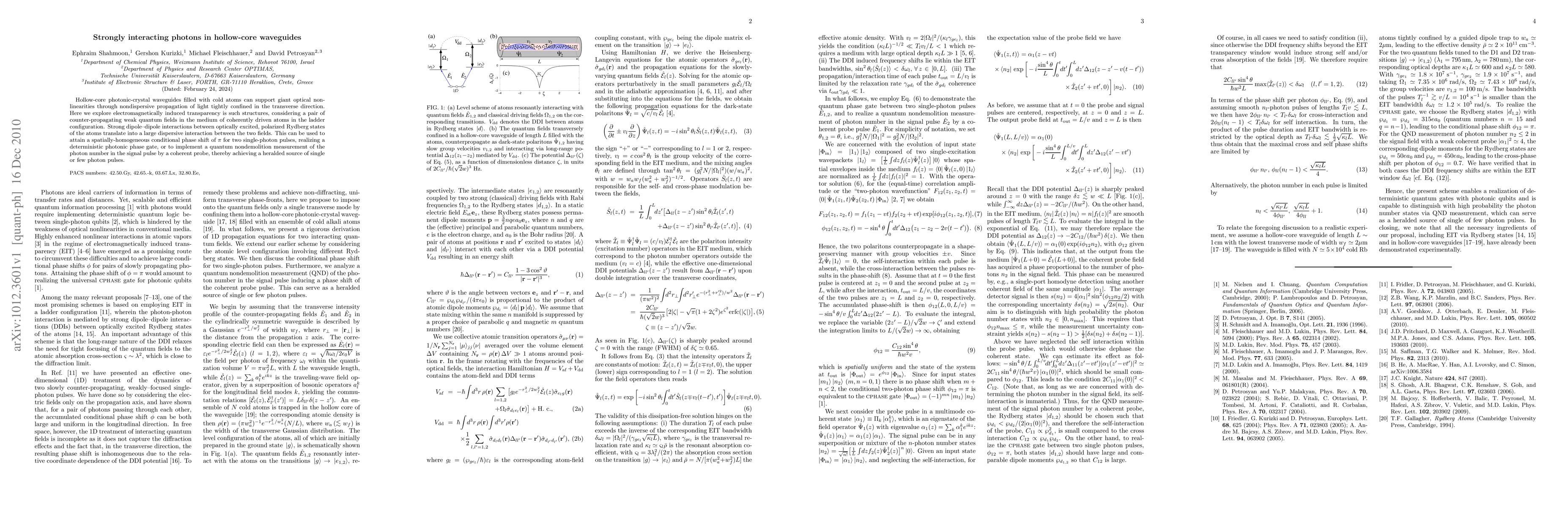 This paper investigates the use of hollow-core photonic-crystal waveguides filled with cold atoms to achieve giant optical nonlinearities via electromagnetically induced transparency. It demonstrates strong dipole-dipole interactions in Rydberg states, enabling a deterministic photonic phase gate and a heralded source of single or few photon pulses.