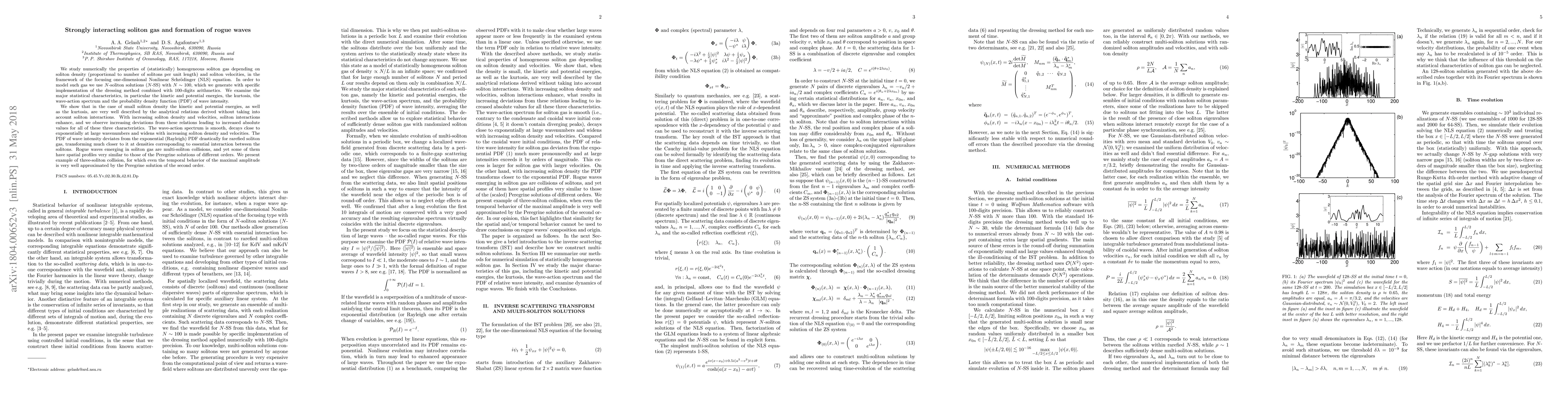 This paper numerically investigates the statistical properties of a soliton gas in the one-dimensional Nonlinear Schrödinger equation, showing that low soliton density maintains simple analytical relations, while increased density and velocities lead to enhanced interactions and deviations from these relations. Rogue waves emerge from multi-soliton collisions, with some resembling the Peregrine solution profiles.