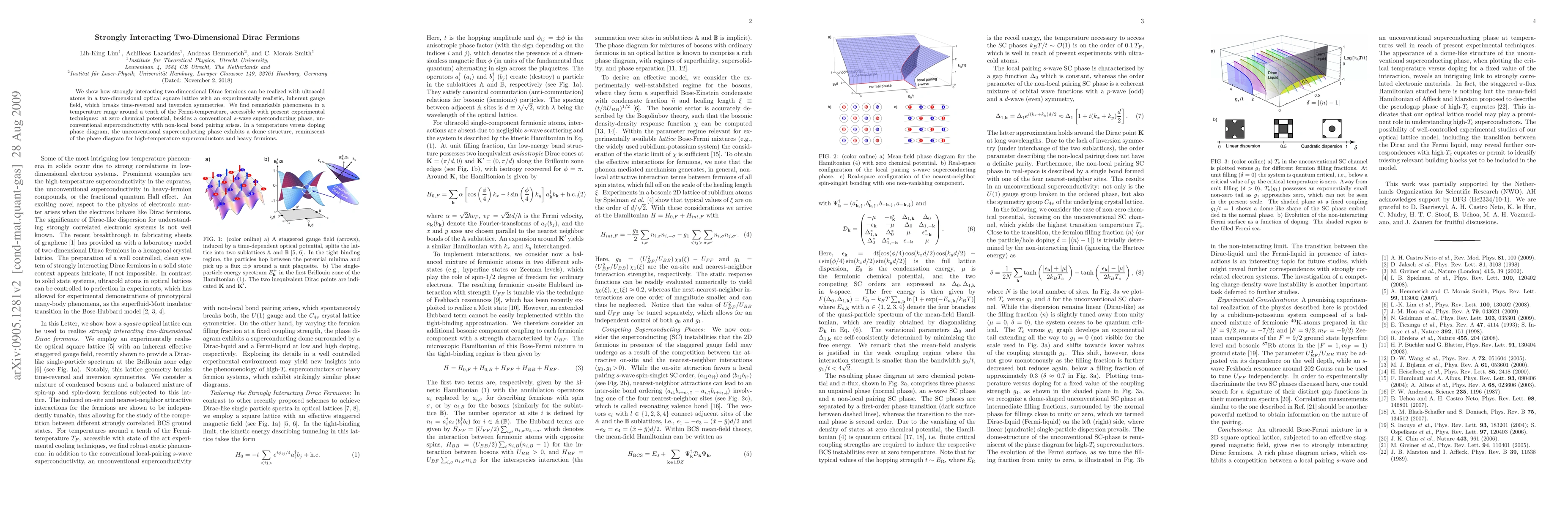 This research demonstrates the realization of strongly interacting two-dimensional Dirac fermions using ultracold atoms in an optical square lattice, revealing phenomena like unconventional superconductivity with non-local bond pairing. The study highlights a superconducting dome structure in temperature versus doping, analogous to high-temperature superconductors.