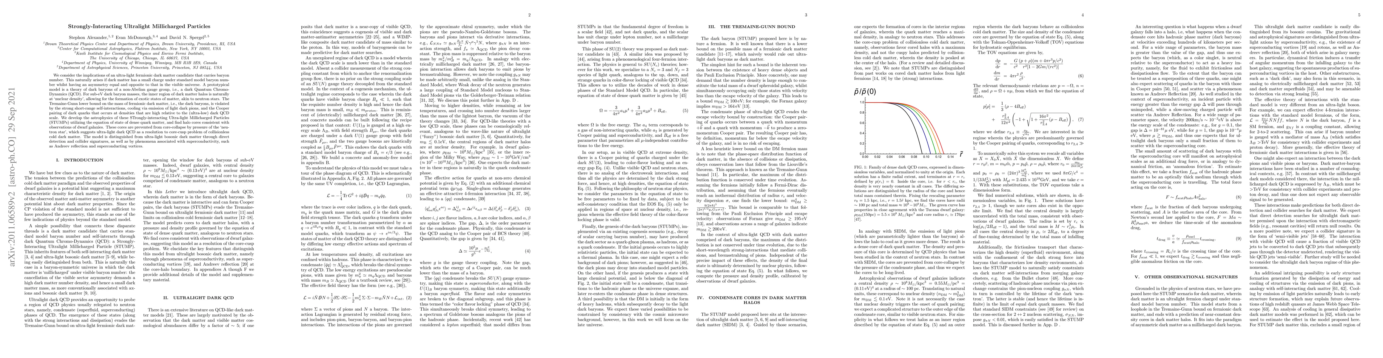 We consider the implications of an ultra-light fermionic dark matter candidate that carries baryon number. This naturally arises if dark matter has a small charge under standard model baryon number whilst having an asymmetry equal and opposite to that in the visible universe. A prototypical model is a theory of dark baryons of a non-Abelian gauge group, i.e., a dark Quantum Chromo-Dynamics (QCD). For sub-eV dark baryon masses, the inner region of dark matter halos is naturally at 'nuclear density', allowing for the formation of exotic states of matter, akin to neutron stars. The Tremaine-Gunn lower bound on the mass of fermionic dark matter, i.e., the dark baryons, is violated by the strong short-range self-interactions, cooling via emission of light dark pions, and the Cooper pairing of dark quarks that occurs at densities that are high relative to the (ultra-low) dark QCD scale. We develop the astrophysics of these STrongly-interacting Ultra-light Millicharged Particles (STUMPs) utilizing the equation of state of dense quark matter, and find halo cores consistent with observations of dwarf galaxies. These cores are prevented from core-collapse by pressure of the 'neutron star', which suggests ultra-light dark QCD as a resolution to core-cusp problem of collisionless cold dark matter. The model is distinguished from ultra-light bosonic dark matter through direct detection and collider signatures, as well as by phenomena associated with superconductivity, such as Andreev reflection and superconducting vortices.