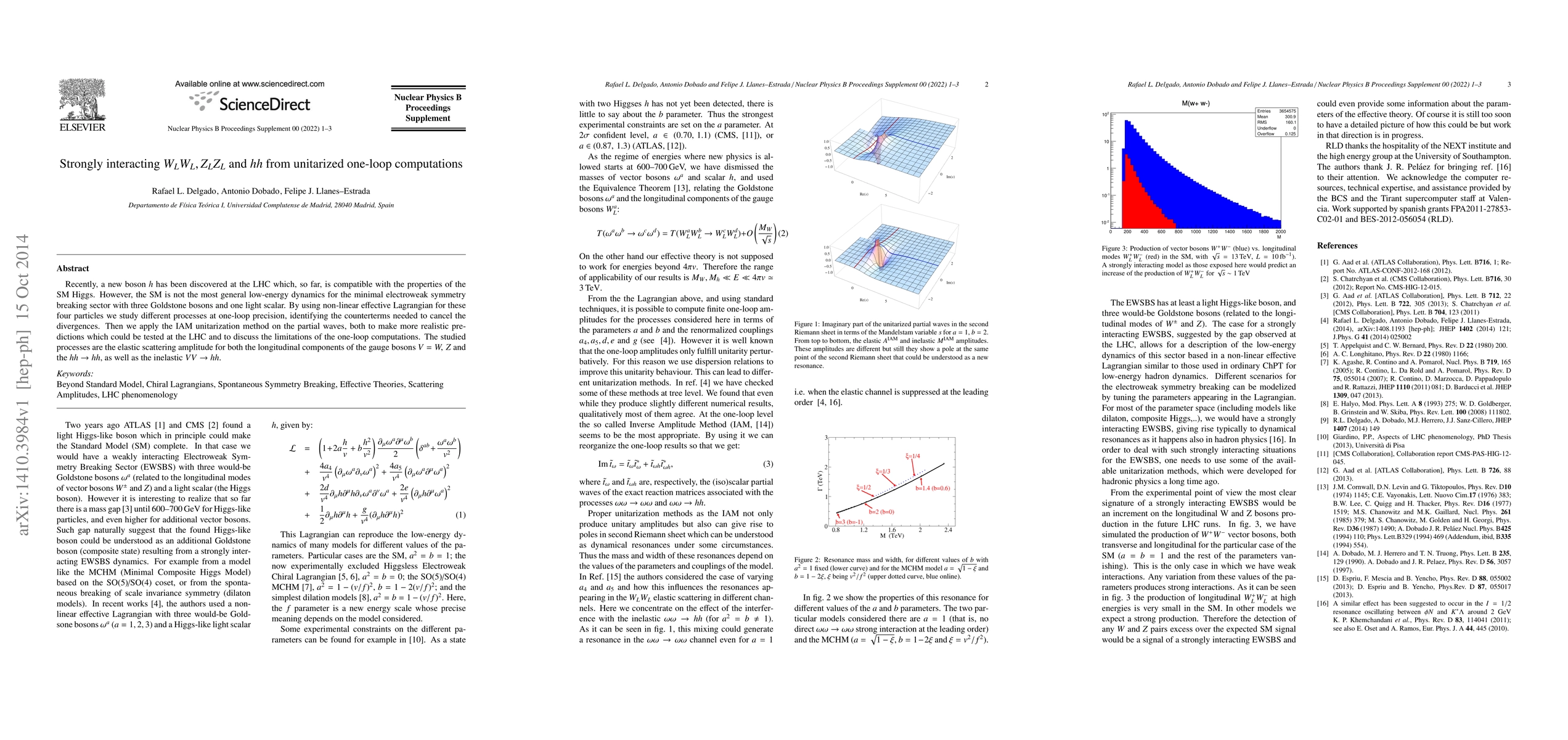 Recently, a new boson h has been discovered at the LHC which, so far, is compatible with the properties of the SM Higgs. However, the SM is not the most general low-energy dynamics for the minimal electroweak symmetry breaking sector with three Goldstone bosons and one light scalar. By using non-linear effective Lagrangian for these four particles we study different processes at one-loop precision, identifying the counterterms needed to cancel the divergences. Then we apply the IAM unitarization method on the partial waves, both to make more realistic predictions which could be tested at the LHC and to discuss the limitations of the one-loop computations. The studied processes are the elastic scattering amplitude for both the longitudinal components of the gauge bosons V = W, Z and the hh -> hh, as well as the inelastic VV -> hh.