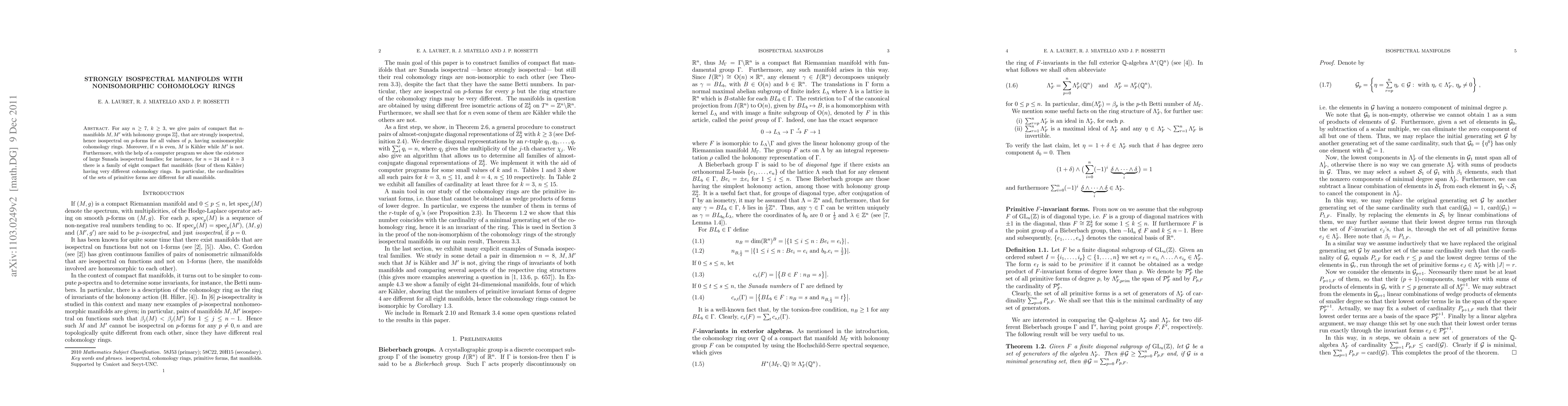 This paper presents pairs of compact flat $n$-manifolds ($n\geq 7$, $k\geq 3$) with holonomy groups $\mathbb Z_2^k$ that are strongly isospectral but have nonisomorphic cohomology rings, with one being Kähler and the other not when $n$ is even. It also demonstrates the existence of large Sunada isospectral families using computational methods.