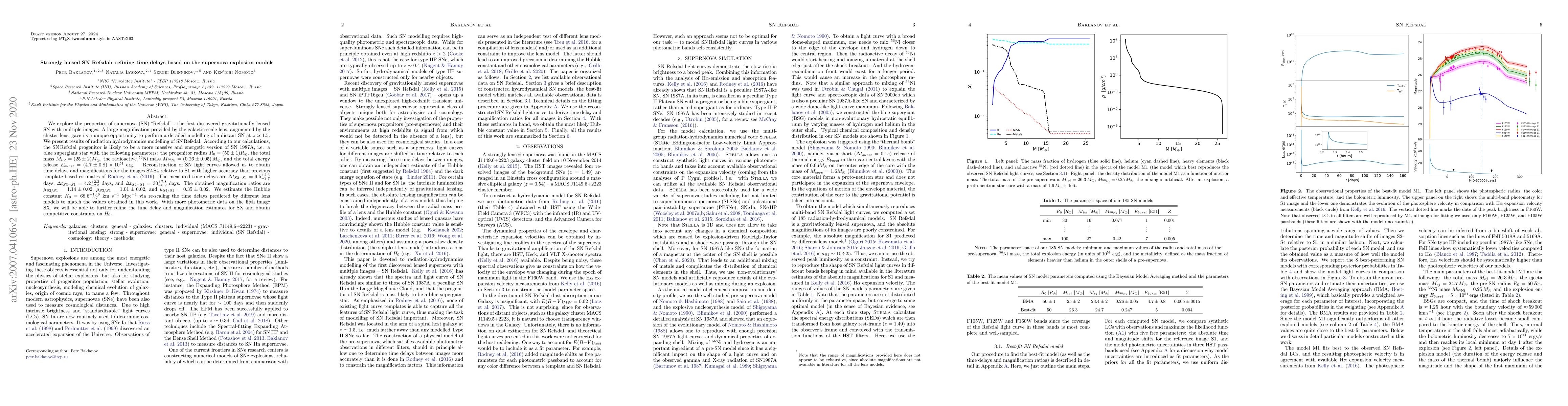 This paper refines time delays for the strongly lensed supernova (SN) Refsdal using detailed radiation hydrodynamics models, finding it to be a massive and energetic blue supergiant. The new time delays are more accurate, leading to a Hubble constant estimate of $H_0 = 68.6^{+13.6}_{-9.7}$ km s$^{-1}$ Mpc$^{-1}$.