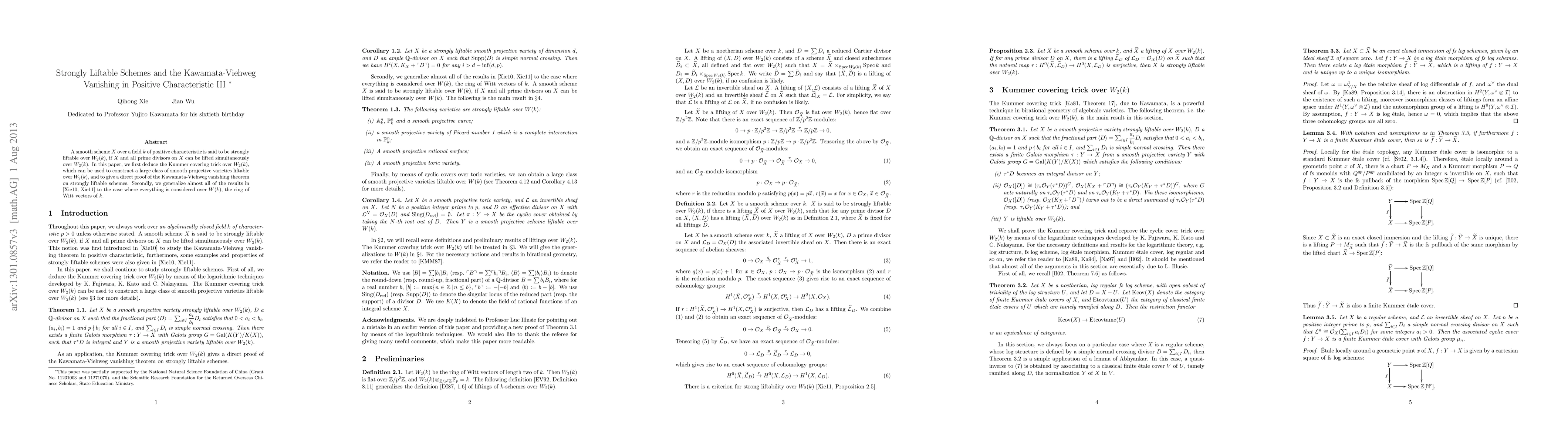 This paper explores strongly liftable smooth schemes over fields of positive characteristic, proving the Kawamata-Viehweg vanishing theorem for such schemes using a Kummer covering trick over W_2(k). It also generalizes prior results from [Xie10, Xie11] to the broader context of W(k), the ring of Witt vectors.