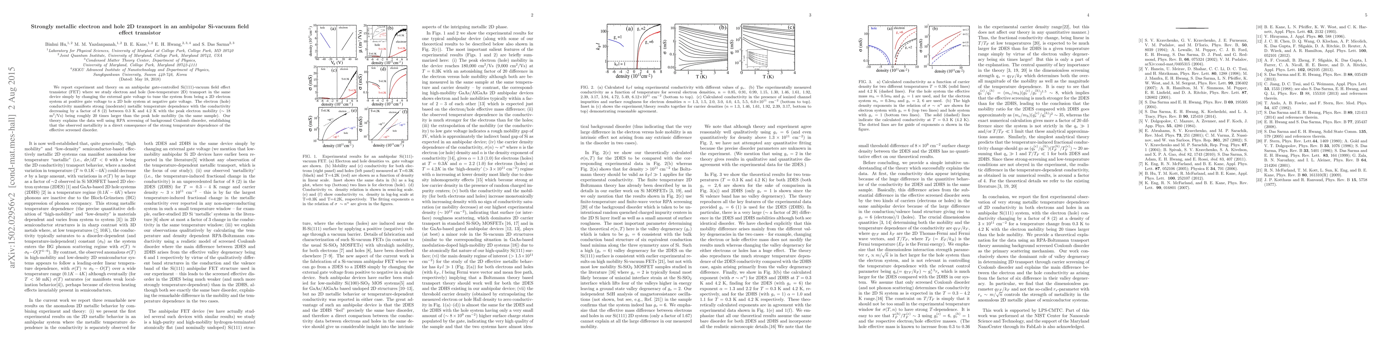 We report experiment and theory on an ambipolar gate-controlled Si-vacuum field effect transistor (FET) where we study electron and hole (low-temperature 2D) transport in the same device simply by changing the external gate voltage to tune the system from being a 2D electron system at positive gate voltage to a 2D hole system at negative gate voltage. The electron (hole) conductivity manifests strong (moderate) metallic temperature dependence with the conductivity decreasing by a factor of 8 (2) between 0.3 K and 4.2 K with the peak electron mobility ($\sim 18$ m$^2$/Vs) being roughly 20 times larger than the peak hole mobility (in the same sample). Our theory explains the data well using RPA screening of background Coulomb disorder, establishing that the observed metallicity is a direct consequence of the strong temperature dependence of the effective screened disorder.