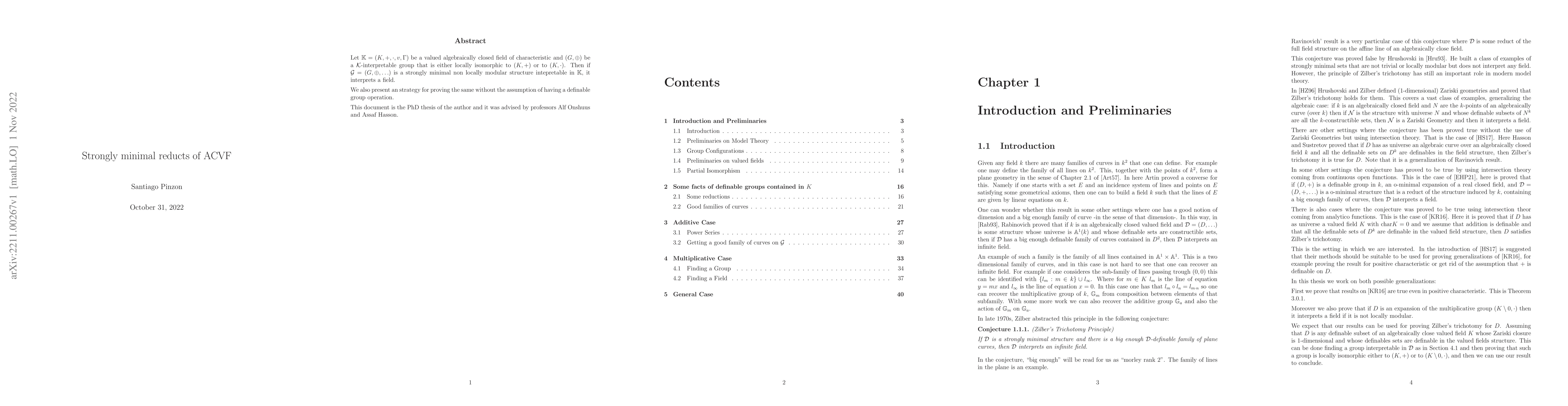 This paper explores strongly minimal reducts of valued algebraically closed fields, showing that certain $\mathcal K$-interpretable groups either locally isomorphic to $(K,+)$ or $(K,\cdot)$ within a strongly minimal structure interpretable in $\mathbb K$ actually interpret a field. A strategy is also proposed for proving this without assuming a definable group operation.