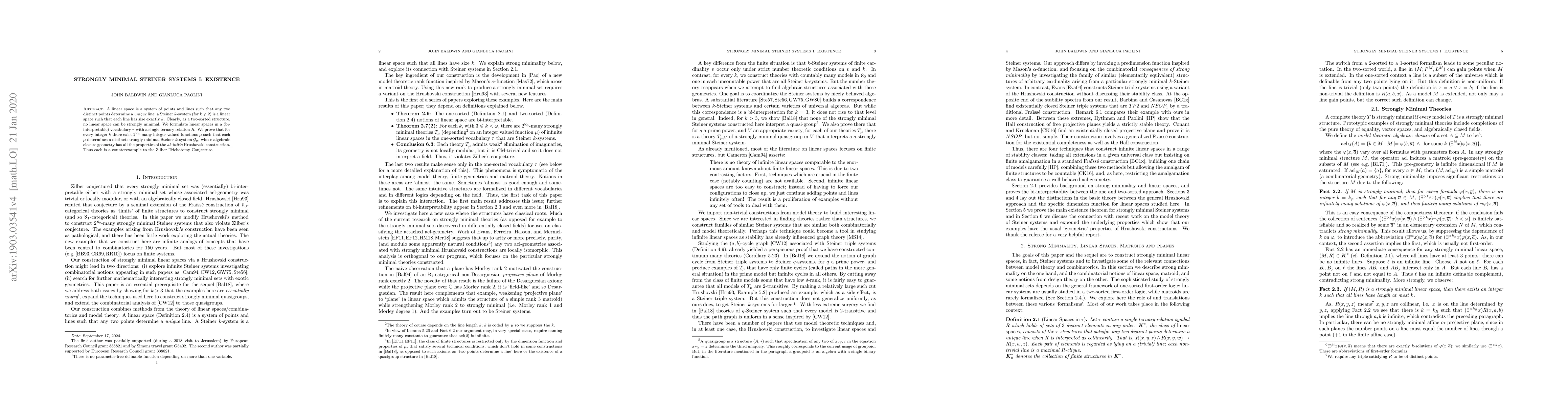 A linear space is a system of points and lines such that any two distinct points determine a unique line; a Steiner $k$-system (for $k \geq 2$) is a linear space such that each line has size exactly $k$. Clearly, as a two-sorted structure, no linear space can be strongly minimal. We formulate linear spaces in a (bi-interpretable) vocabulary $\tau$ with a single ternary relation $R$. We prove that for every integer $k$ there exist $2^{\aleph_0}$-many integer valued functions $\mu$ such that each $\mu$ determines a distinct strongly minimal Steiner $k$-system $\mathcal{G}_\mu$, whose algebraic closure geometry has all the properties of the ab initio Hrushovski construction. Thus each is a counterexample to the Zilber Trichotomy Conjecture.