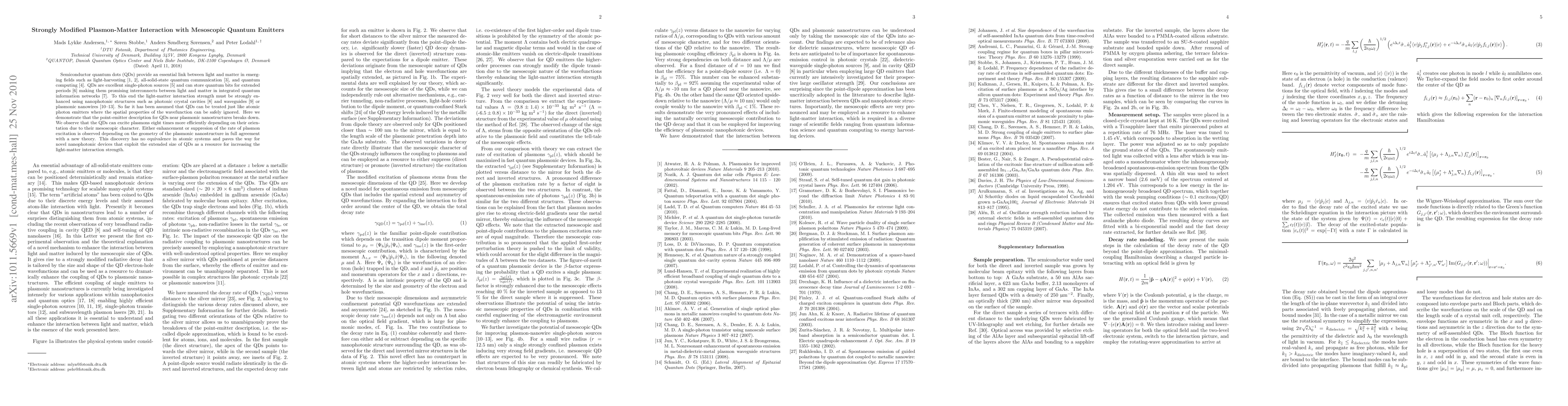 Semiconductor quantum dots (QDs) provide an essential link between light and matter in emerging fields such as light-harvesting, all-solid-state quantum communication, and quantum computing. QDs are excellent single-photon sources and can store quantum bits for extended periods making them promising interconnects between light and matter in integrated quantum information networks. To this end the light-matter interaction strength must be strongly enhanced using nanophotonic structures such as photonic crystal cavities and waveguides or plasmonic nanowires. So far it has been assumed that QDs can be treated just like atomic photon emitters where the spatial properties of the wavefunction can be safely ignored. Here we demonstrate that the point-emitter description for QDs near plasmonic nanostructures breaks down. We observe that the QDs can excite plasmons eight times more efficiently depending on their orientation due to their mesoscopic character. Either enhancement or suppresion of the rate of plasmon excitation is observed depending on the geometry of the plasmonic nanostructure in full agreement with a new theory. This discovery has no equivalence in atomic systems and paves the way for novel nanophotonic devices that exploit the extended size of QDs as a resource for increasing the light-matter interaction strength.