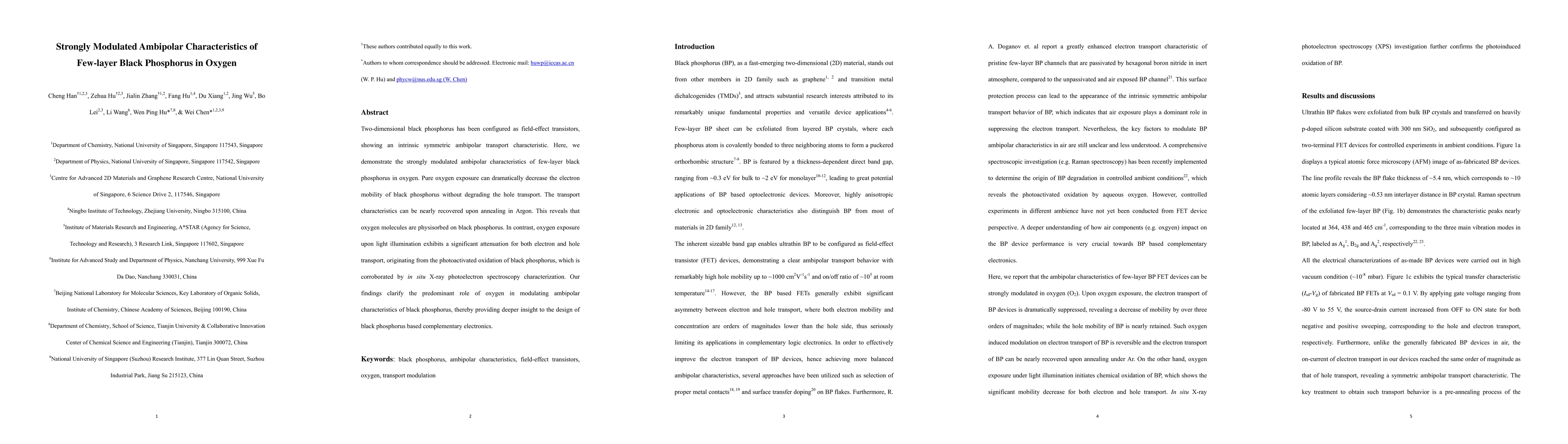 This study investigates the ambipolar transport characteristics of few-layer black phosphorus under oxygen exposure, showing that pure oxygen decreases electron mobility without affecting hole transport, which can be restored via Argon annealing. Under light illumination, oxygen exposure significantly reduces both electron and hole transport due to photoactivated oxidation, highlighting the critical role of oxygen in modulating black phosphorus's electronic properties.