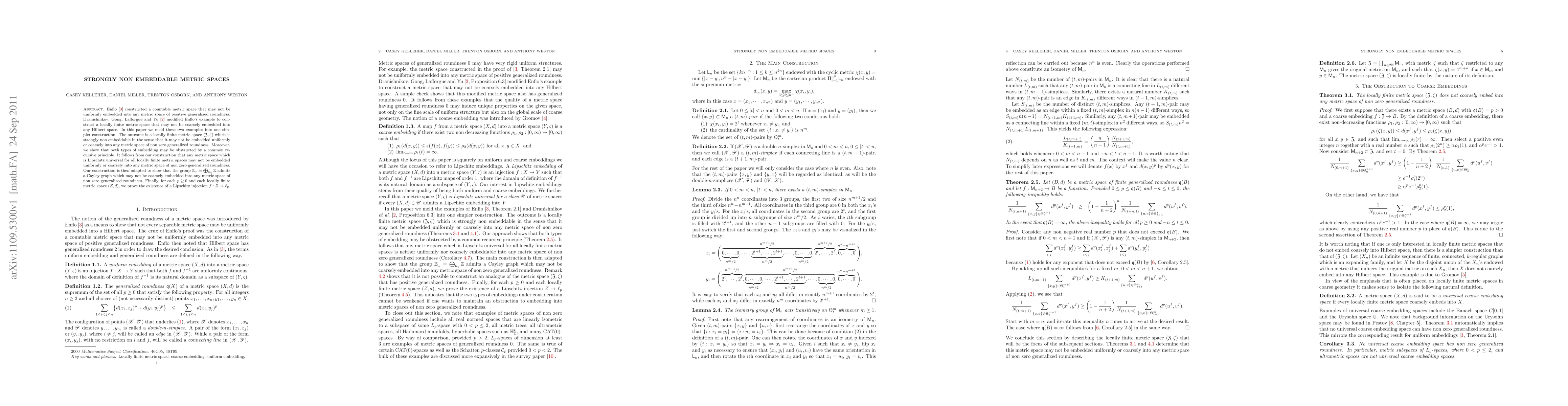 Enflo constructed a countable metric space that may not be uniformly embedded into any metric space of positive generalized roundness. Dranishnikov, Gong, Lafforgue and Yu modified Enflo's example to construct a locally finite metric space that may not be coarsely embedded into any Hilbert space. In this paper we meld these two examples into one simpler construction. The outcome is a locally finite metric space $(\mathfrak{Z}, \zeta)$ which is strongly non embeddable in the sense that it may not be embedded uniformly or coarsely into any metric space of non zero generalized roundness. Moreover, we show that both types of embedding may be obstructed by a common recursive principle. It follows from our construction that any metric space which is Lipschitz universal for all locally finite metric spaces may not be embedded uniformly or coarsely into any metric space of non zero generalized roundness. Our construction is then adapted to show that the group $\mathbb{Z}_\omega=\bigoplus_{\aleph_0}\mathbb{Z}$ admits a Cayley graph which may not be coarsely embedded into any metric space of non zero generalized roundness. Finally, for each $p \geq 0$ and each locally finite metric space $(Z,d)$, we prove the existence of a Lipschitz injection $f : Z \to \ell_{p}$.
