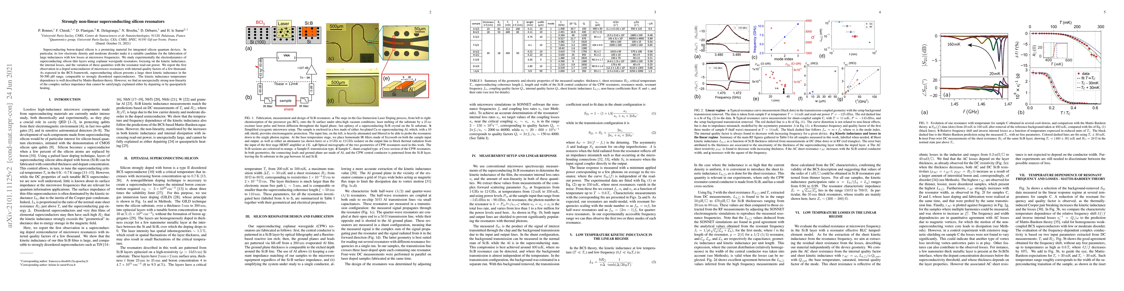 Superconducting boron doped silicon is a promising material for integrated silicon quantum devices. In particular, its low electronic density and moderate disorder make it a suitable candidate for the fabrication of large inductances with low losses at microwave frequencies. Here, we study experimentally the electrodynamics of superconducting silicon thin layers patterned in coplanar waveguide resonators, targeting three key properties: kinetic inductance, internal losses, and the variation of these quantities with the read-out power. We report the first observation in a doped semiconductor of microwave resonances with internal quality factors of a few thousand. As expected in the BCS framework, superconducting silicon presents a large sheet kinetic inductance, in the 50-500 pH range comparable to strongly disordered superconductors, whose temperature dependence is well described by Mattis-Bardeen theory. We find, though, an unexpectedly strong non-linearity of the complex surface impedance which cannot be explained either as a non-linearity induced by depairing or as quasiparticle heating.