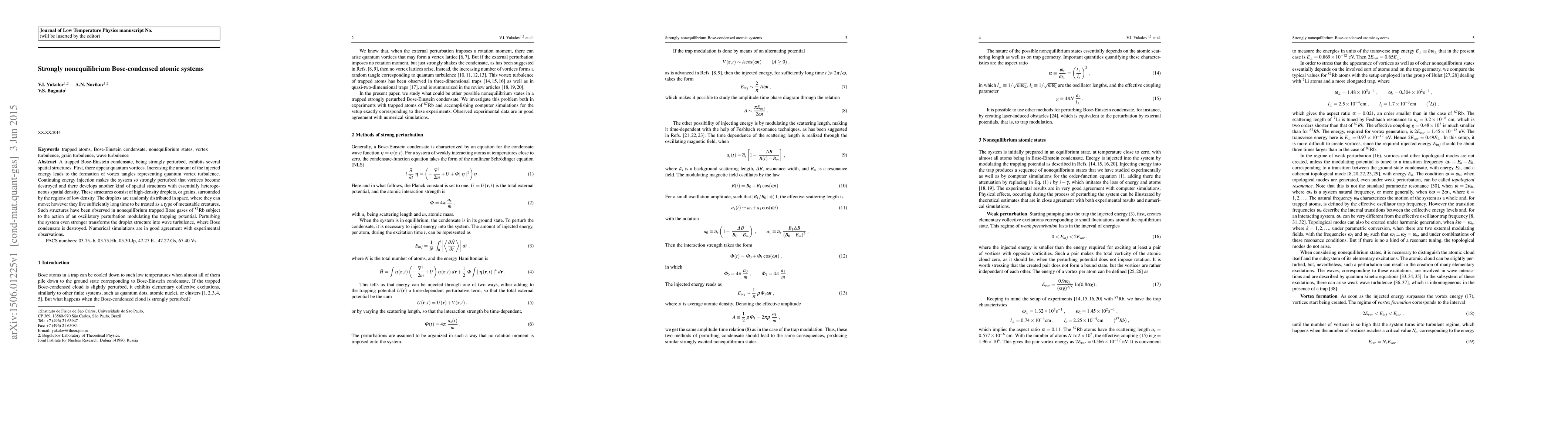 A trapped Bose-Einstein condensate, being strongly perturbed, exhibits several spatial structures. First, there appear quantum vortices. Increasing the amount of the injected energy leads to the formation of vortex tangles representing quantum vortex turbulence. Continuing energy injection makes the system so strongly perturbed that vortices become destroyed and there develops another kind of spatial structures with essentially heterogeneous spatial density. These structures consist of high-density droplets, or grains, surrounded by the regions of low density. The droplets are randomly distributed in space, where they can move; however they live sufficiently long time to be treated as a type of metastable creatures. Such structures have been observed in nonequilibrium trapped Bose gases of $^{87}$Rb subject to the action of an oscillatory perturbation modulating the trapping potential. Perturbing the system even stronger transforms the droplet structure into wave turbulence, where Bose condensate is destroyed. Numerical simulations are in good agreement with experimental observations.