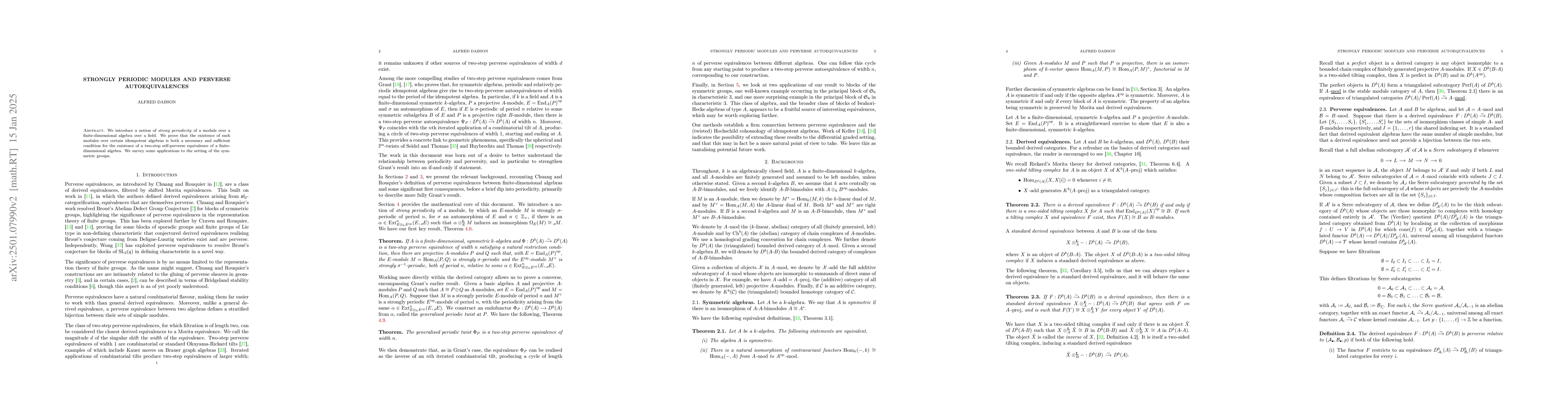 This paper defines strong periodicity in modules over finite-dimensional algebras and shows its equivalence to the existence of two-step self-perverse autoequivalences. It also explores applications to symmetric groups.