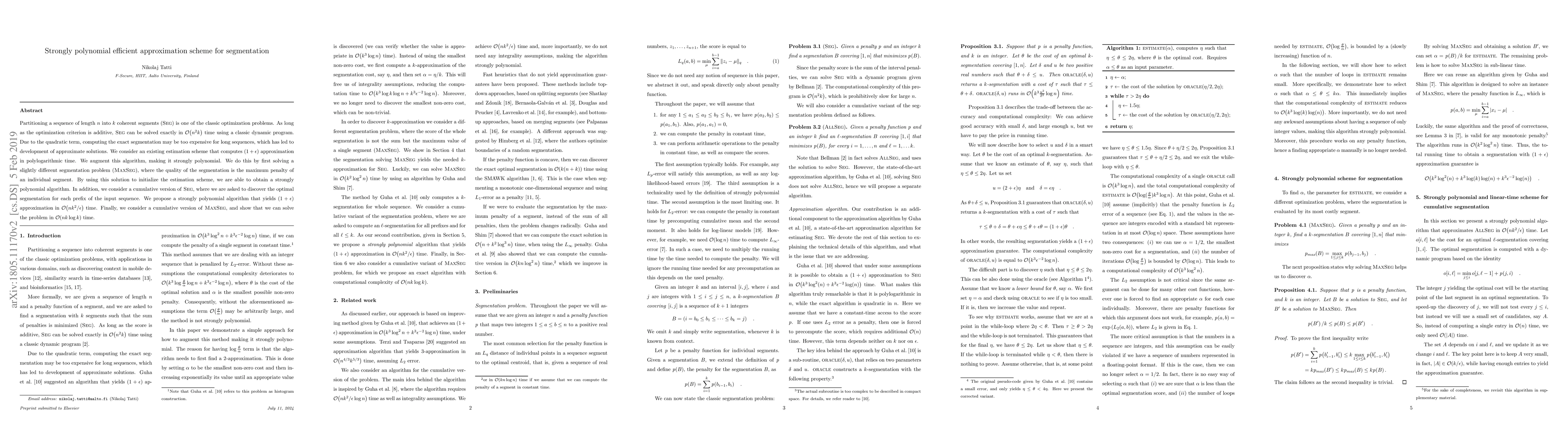 This paper presents a strongly polynomial efficient approximation scheme for segmentation problems, improving an existing estimation scheme to achieve $(1 + \epsilon)$ approximation in polylogarithmic time. It also introduces algorithms for cumulative segmentation and maximum penalty segmentation with improved time complexities.