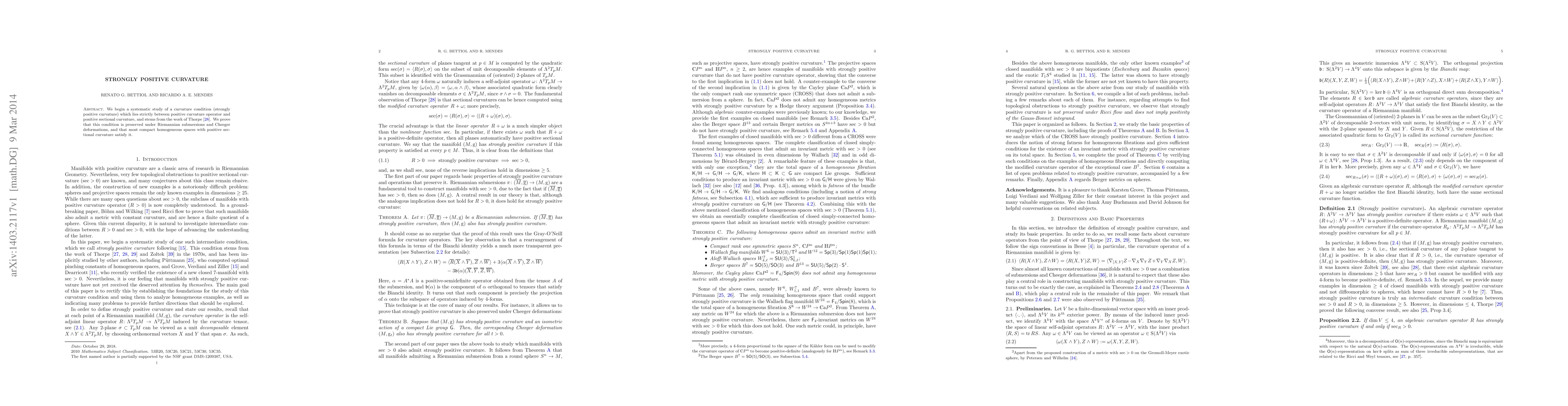 We begin a systematic study of a curvature condition (strongly positive curvature) which lies strictly between positive curvature operator and positive sectional curvature, and stems from the work of Thorpe in the 1970s. We prove that this condition is preserved under Riemannian submersions and Cheeger deformations, and that most compact homogeneous spaces with positive sectional curvature satisfy it.